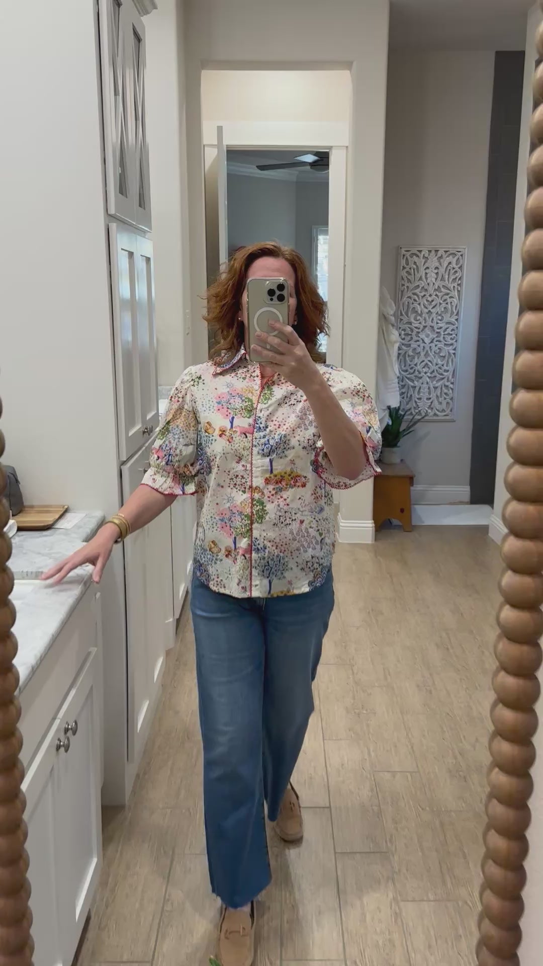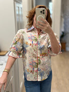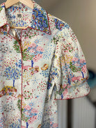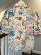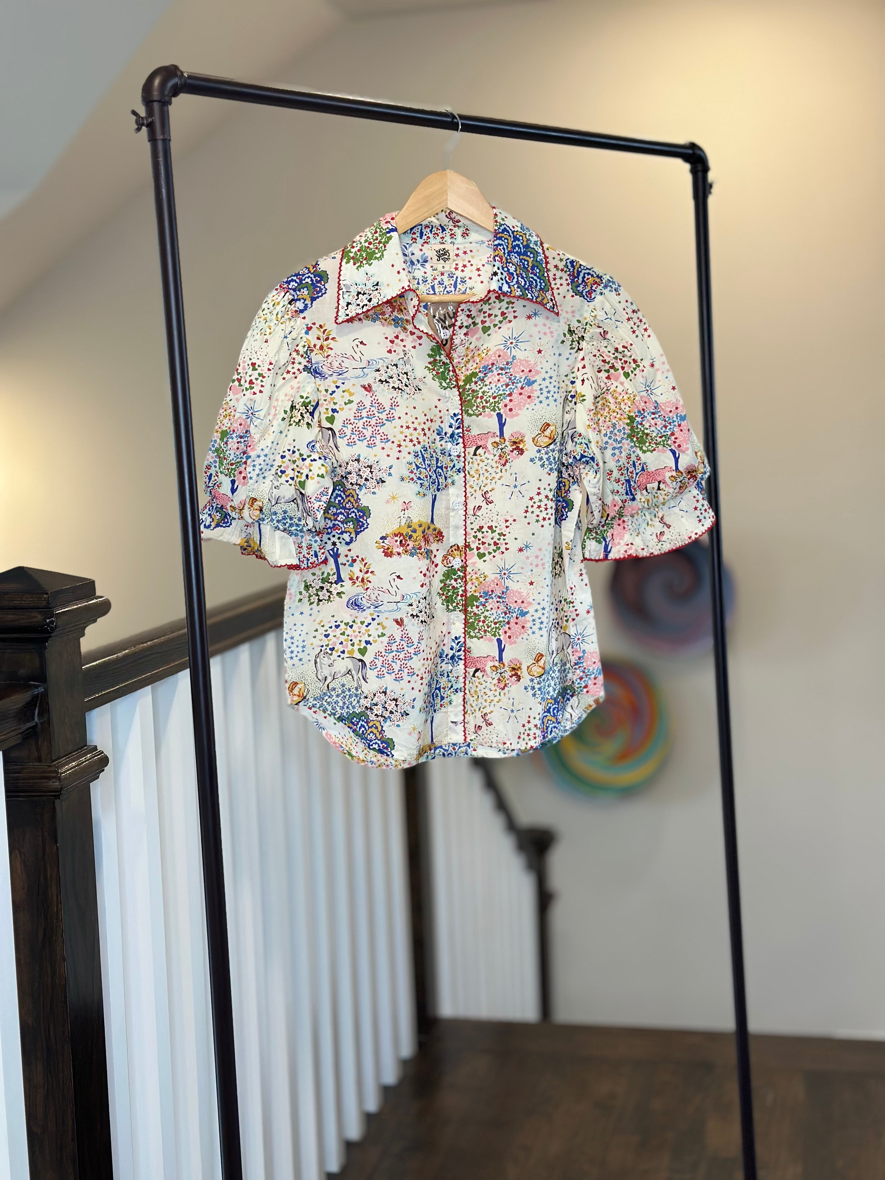 Bring a touch of whimsey to your wardrobe! This classic cotton button-down features puff sleeves and a fun print. Shirttail hem.