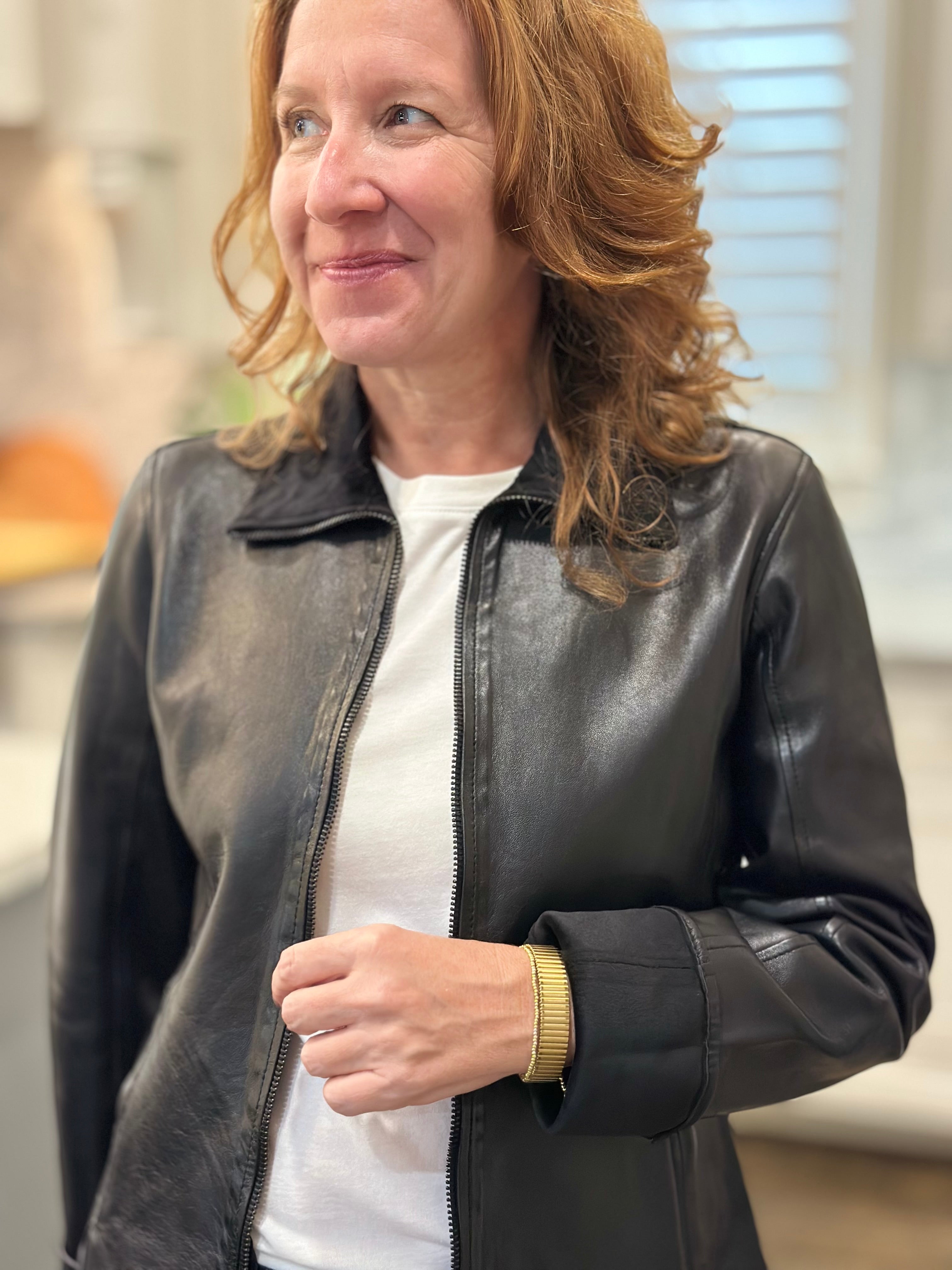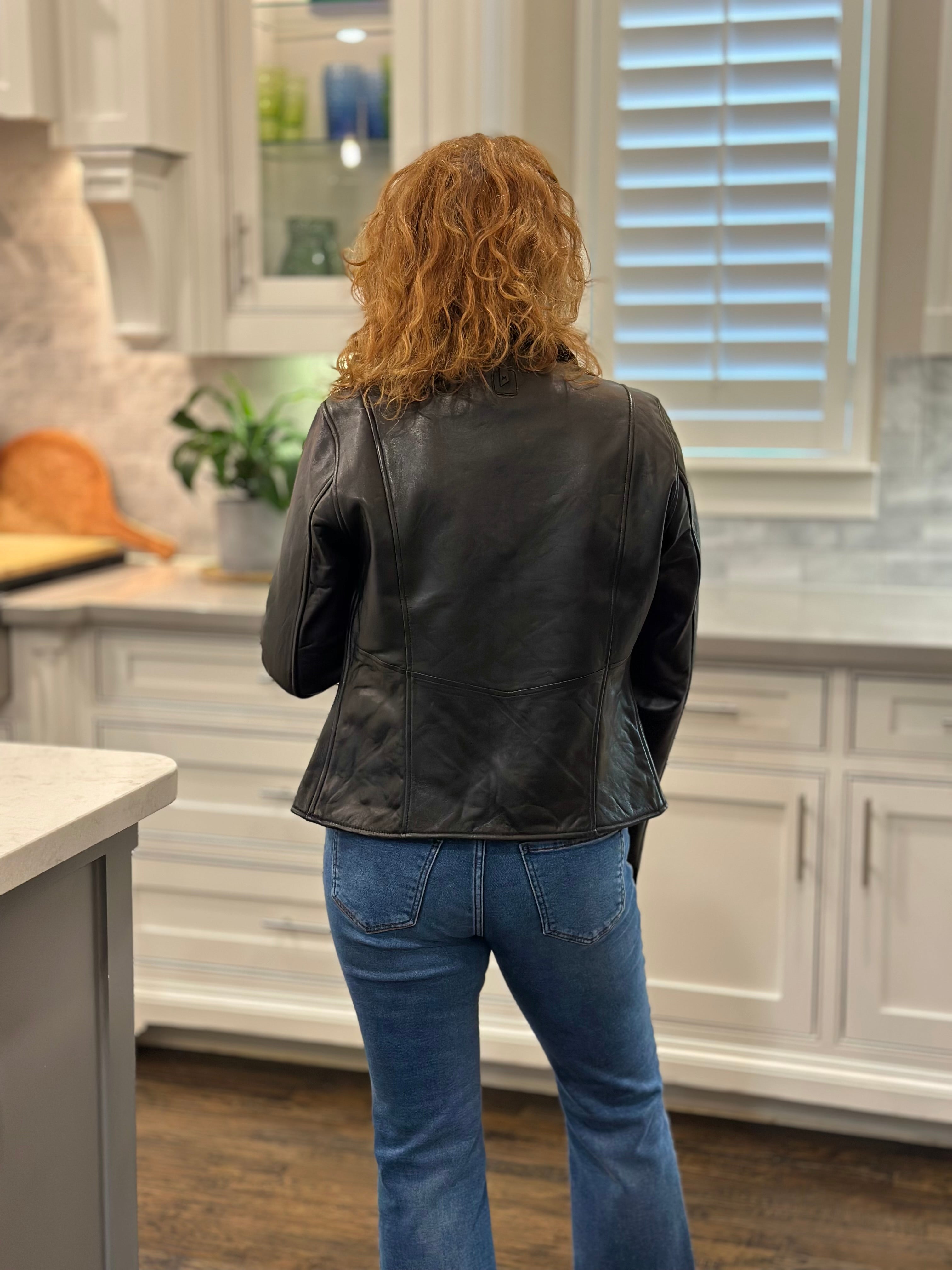 Sleek meets structure. This black leather jacket is made from 100% vegetable-tanned lambskin, offering a smooth, form-fitting silhouette with a minimalist edge.
