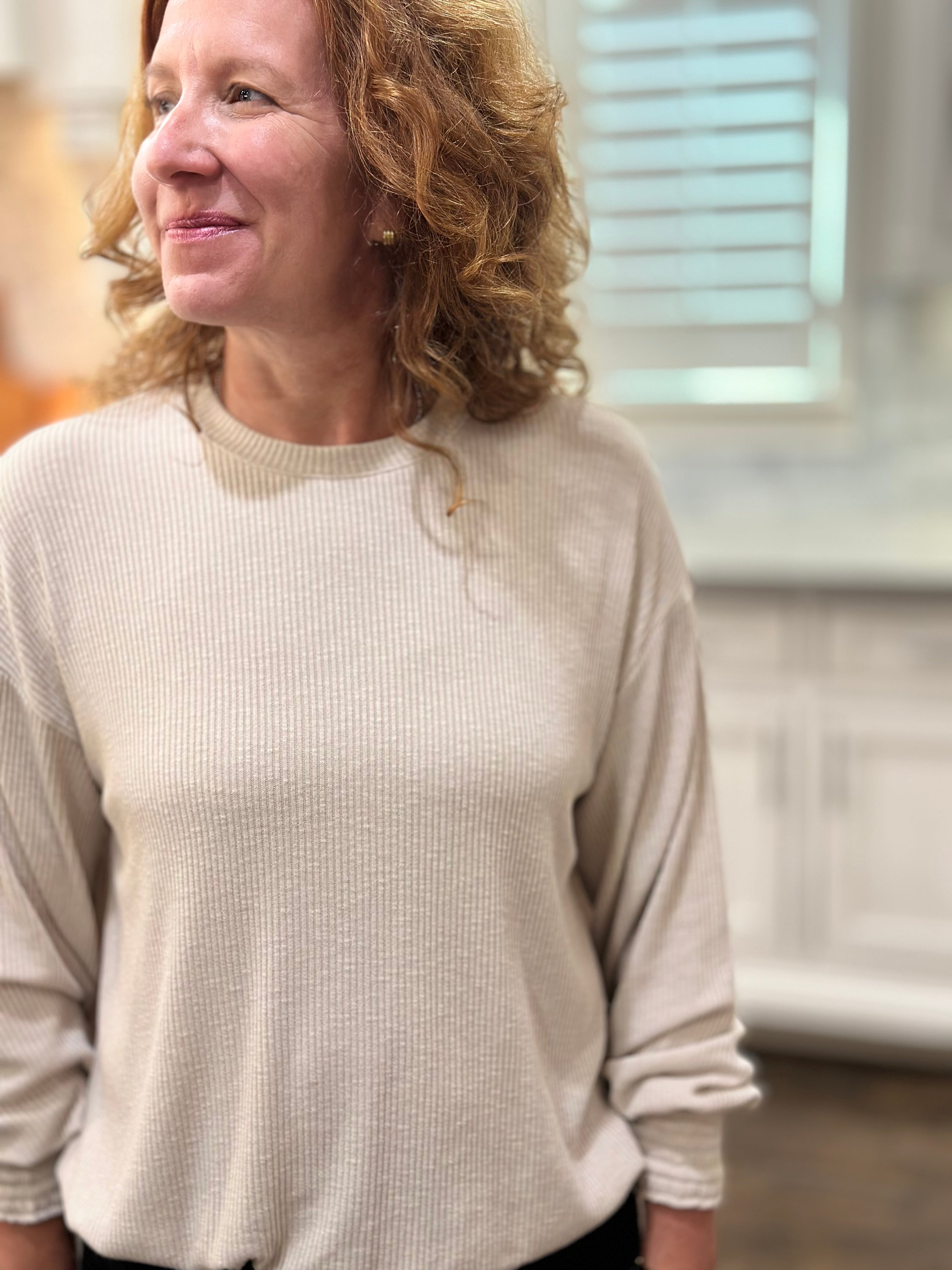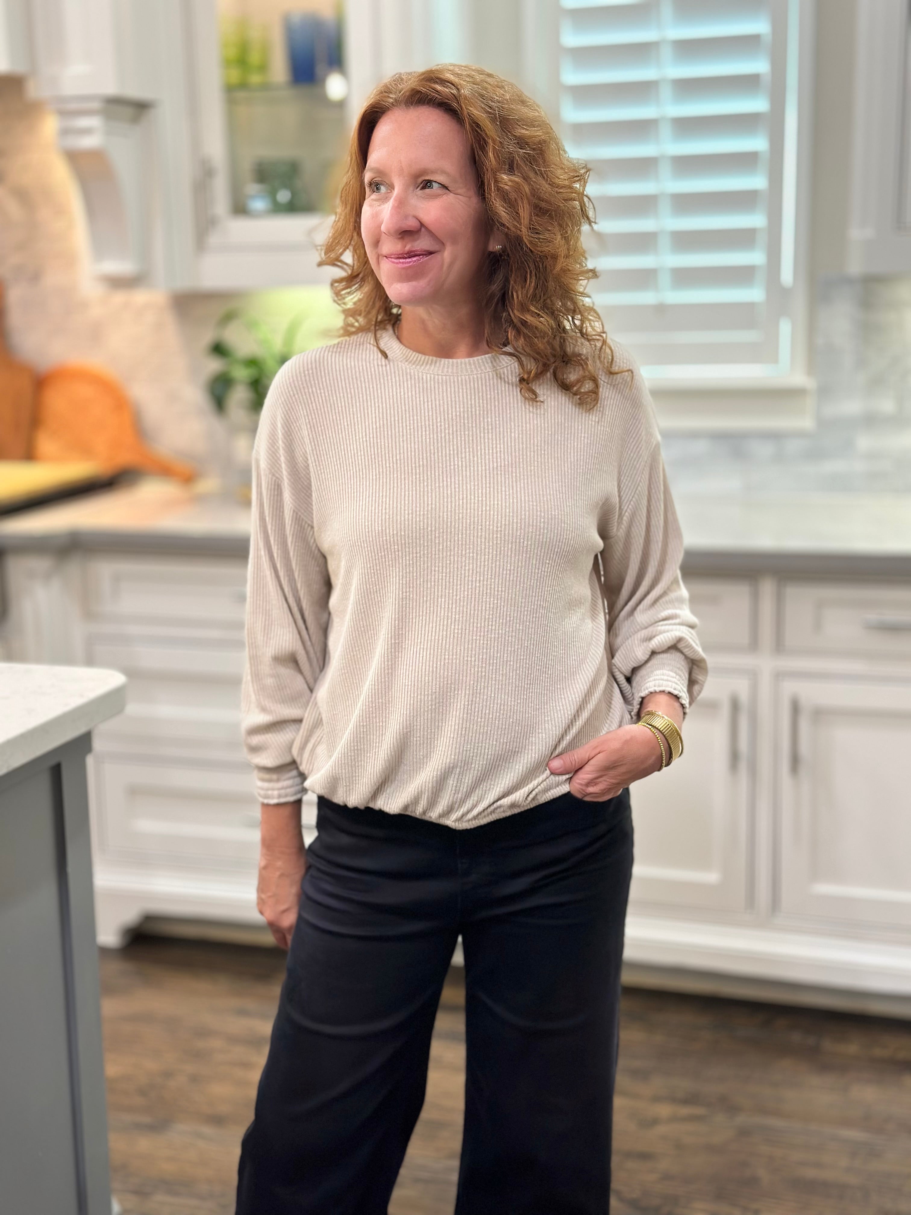 The Tia features a crew neckline, drop shoulders, elastic bottom and bishop sleeves with smocked cuffs. Made from a soft slub stretch jersey fabric that washes well and keeps its shape throughout wearing.