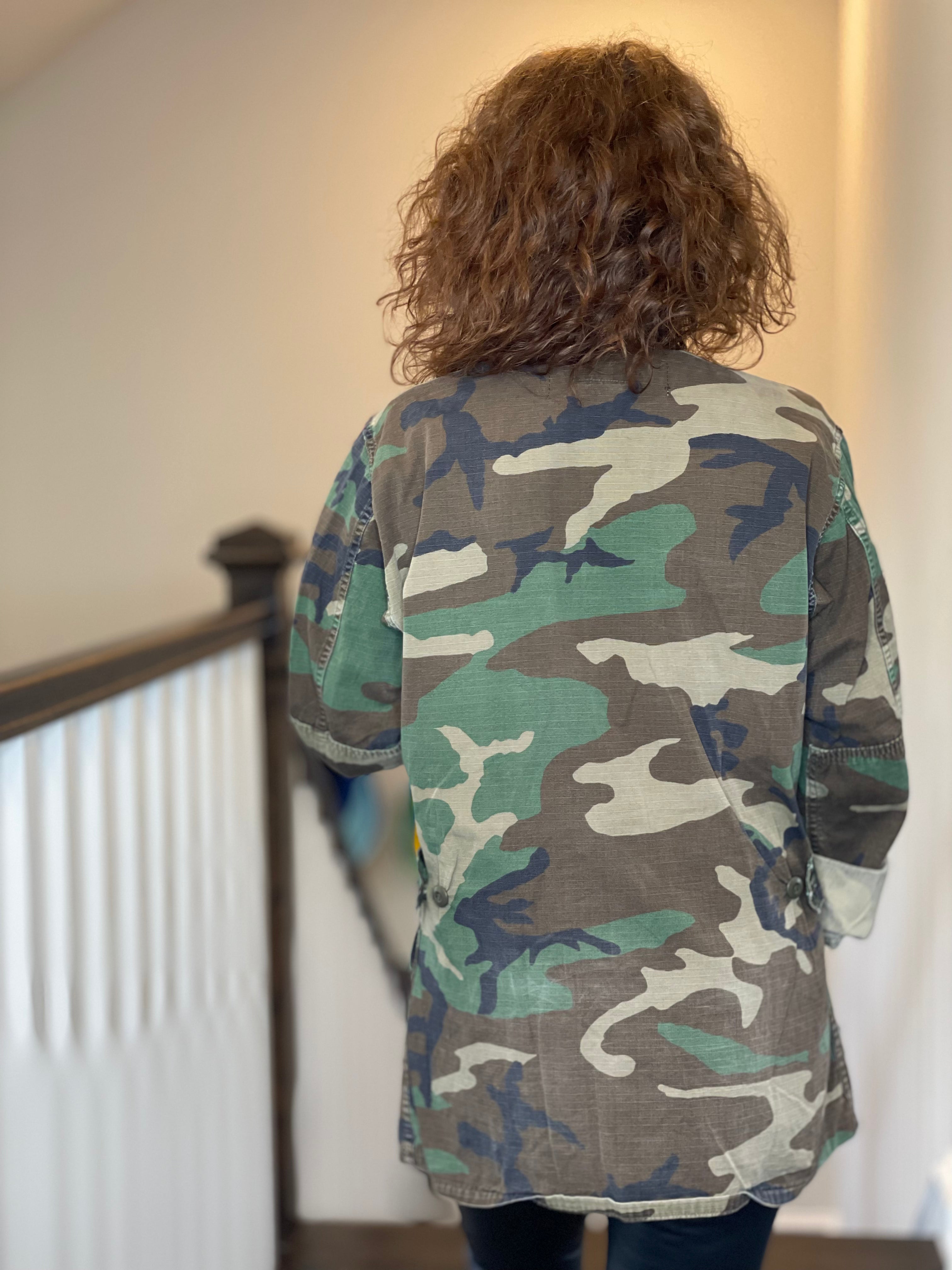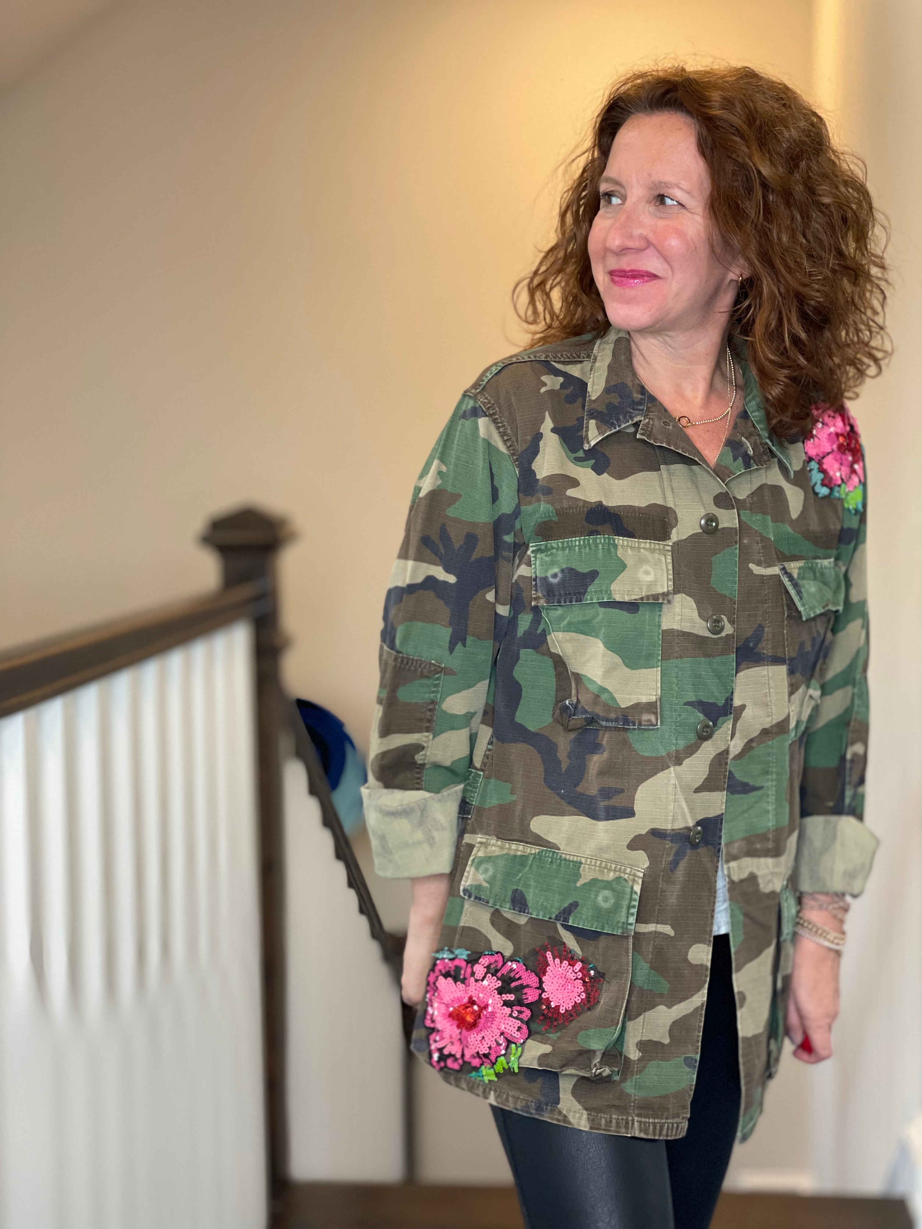 Authentic fatigues upcycled to make a fabulous statement piece jacket. Long cuffed sleeves with a beautiful rose applique on the shoulder and pocket round out the chic look of this jacket. Each jacket is handmade, no two are the same. We recommend requesting a FaceTime appointment if purchasing online to select the exact jacket you'd like. ❤️