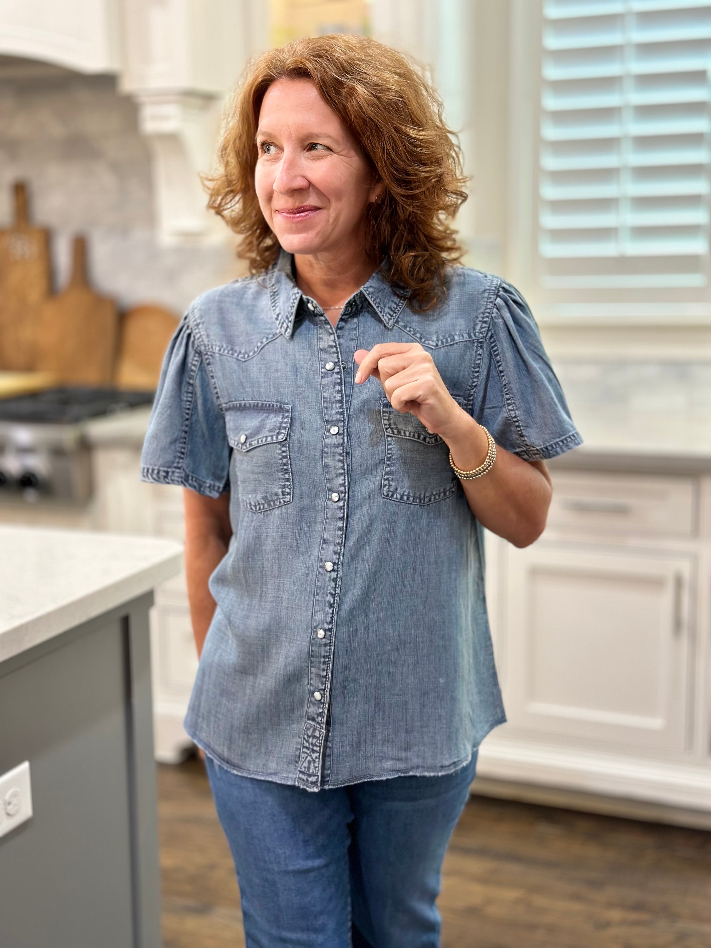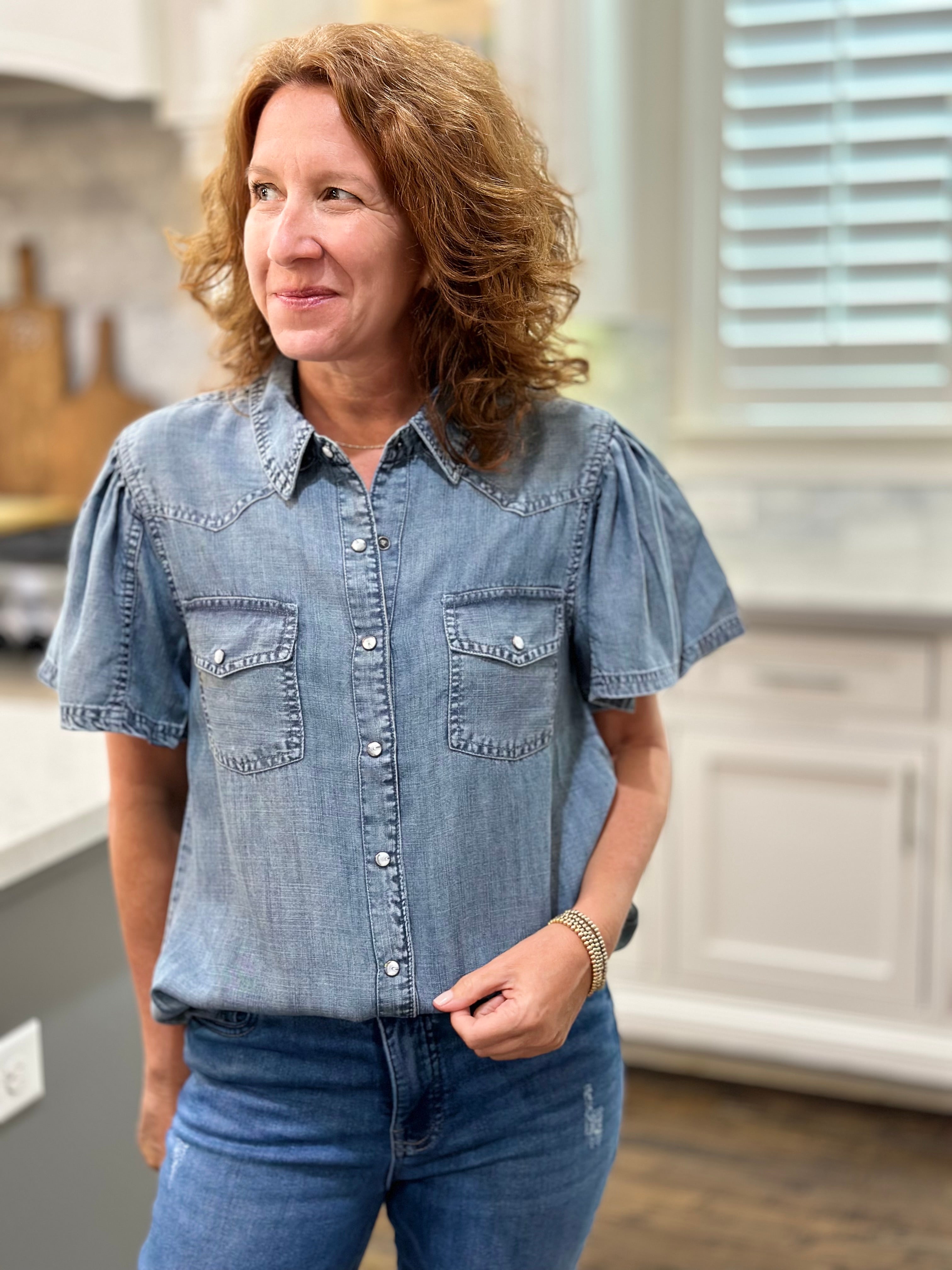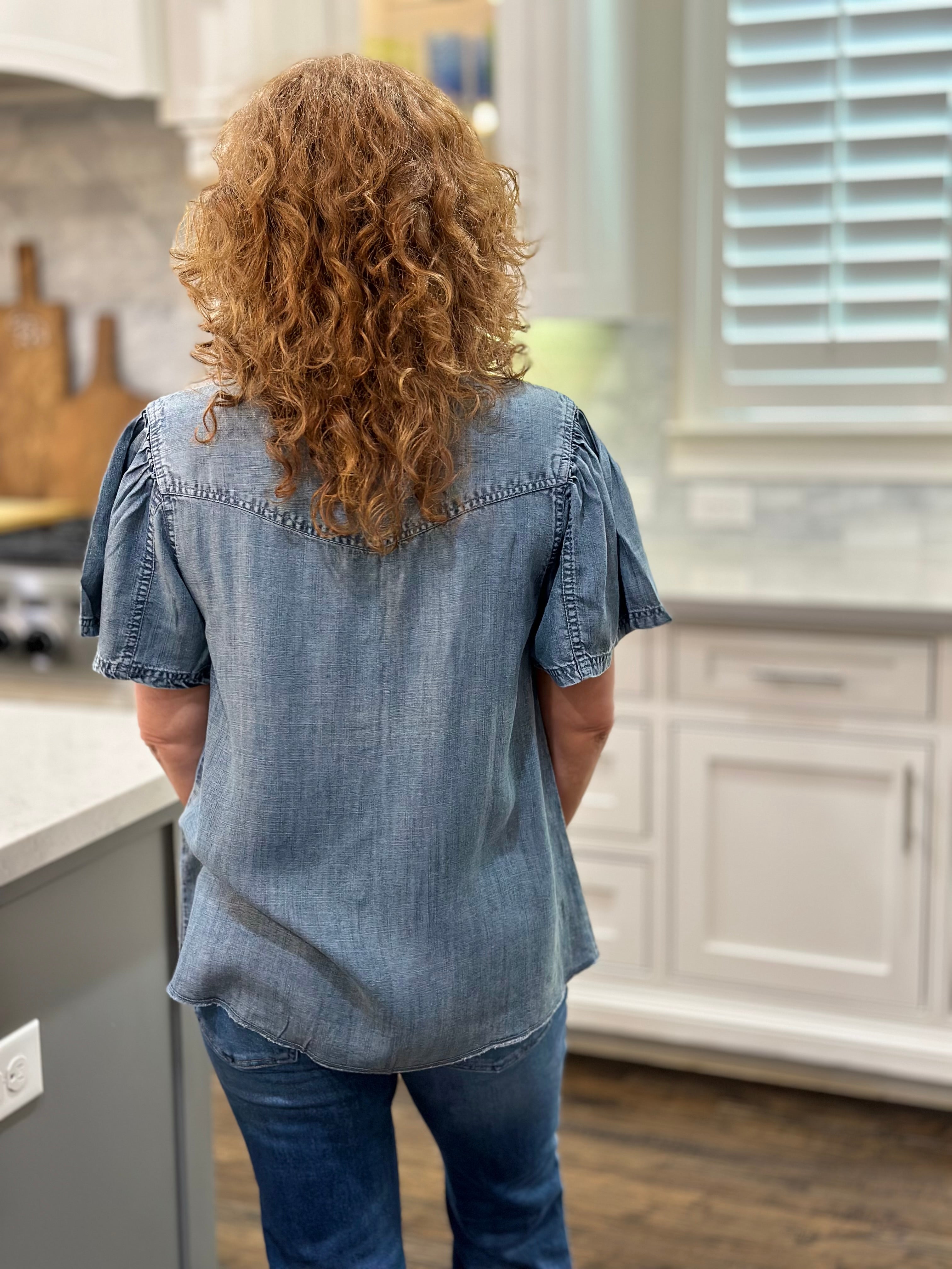 Pearl snaps and short flutter sleeves make this blouse a fun addition to your closet.  Shirttail hem (slightly shorter in the front) and easy fit will make this blouse your go to all season long.  Hits at hip for great coverage.