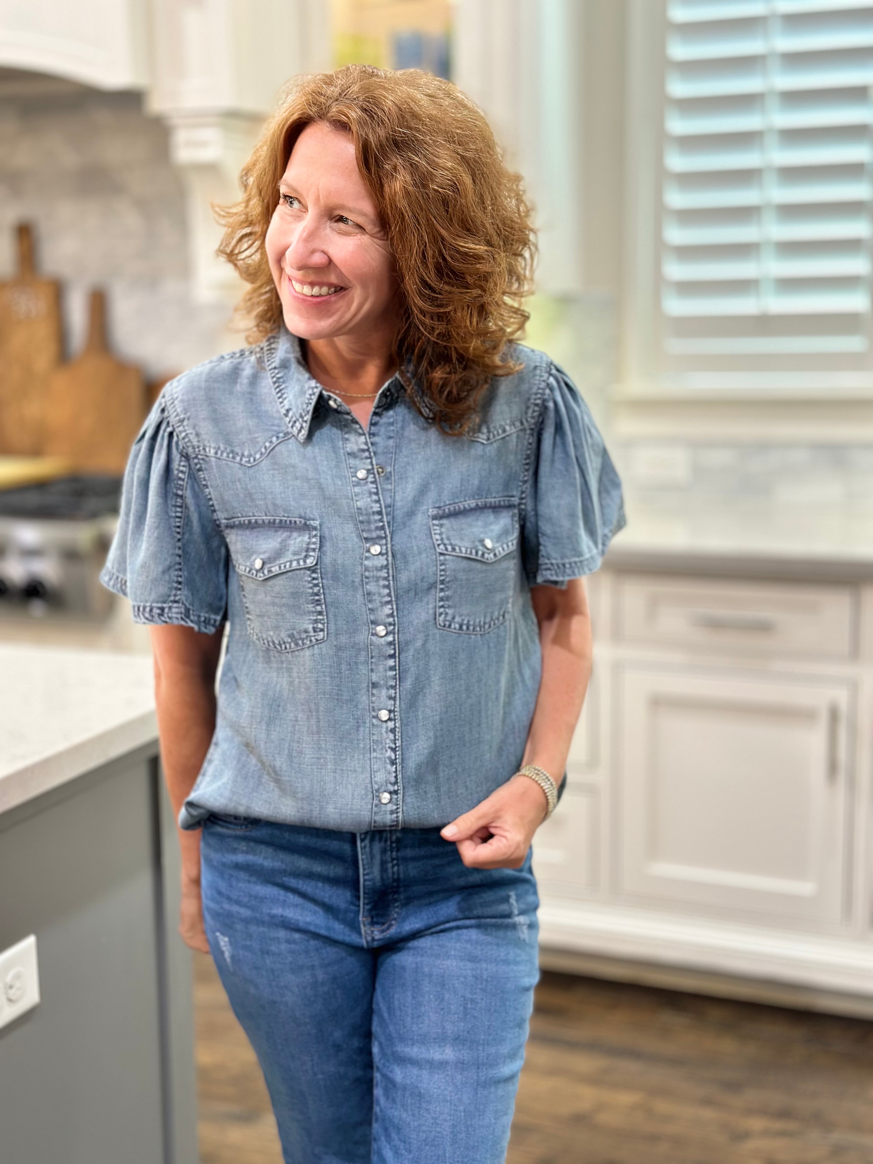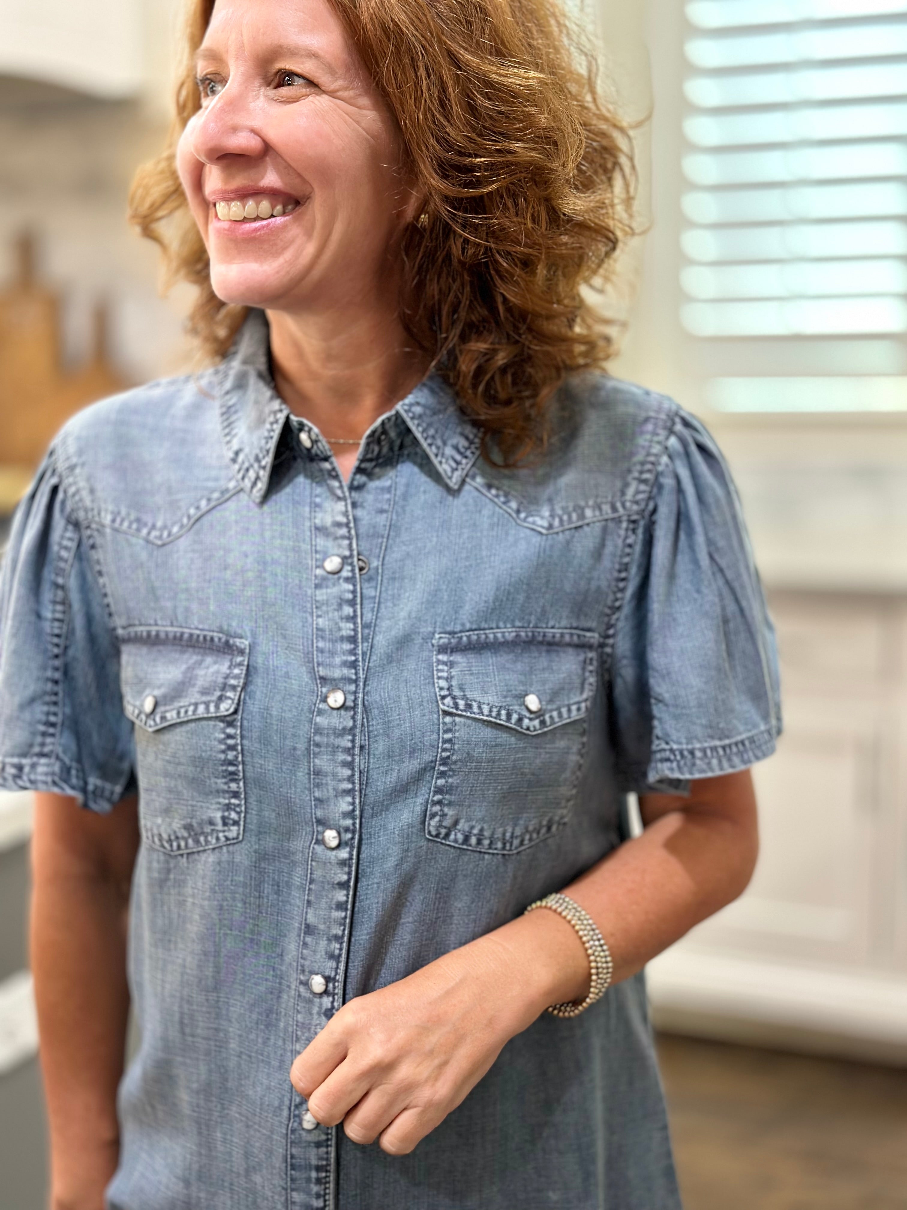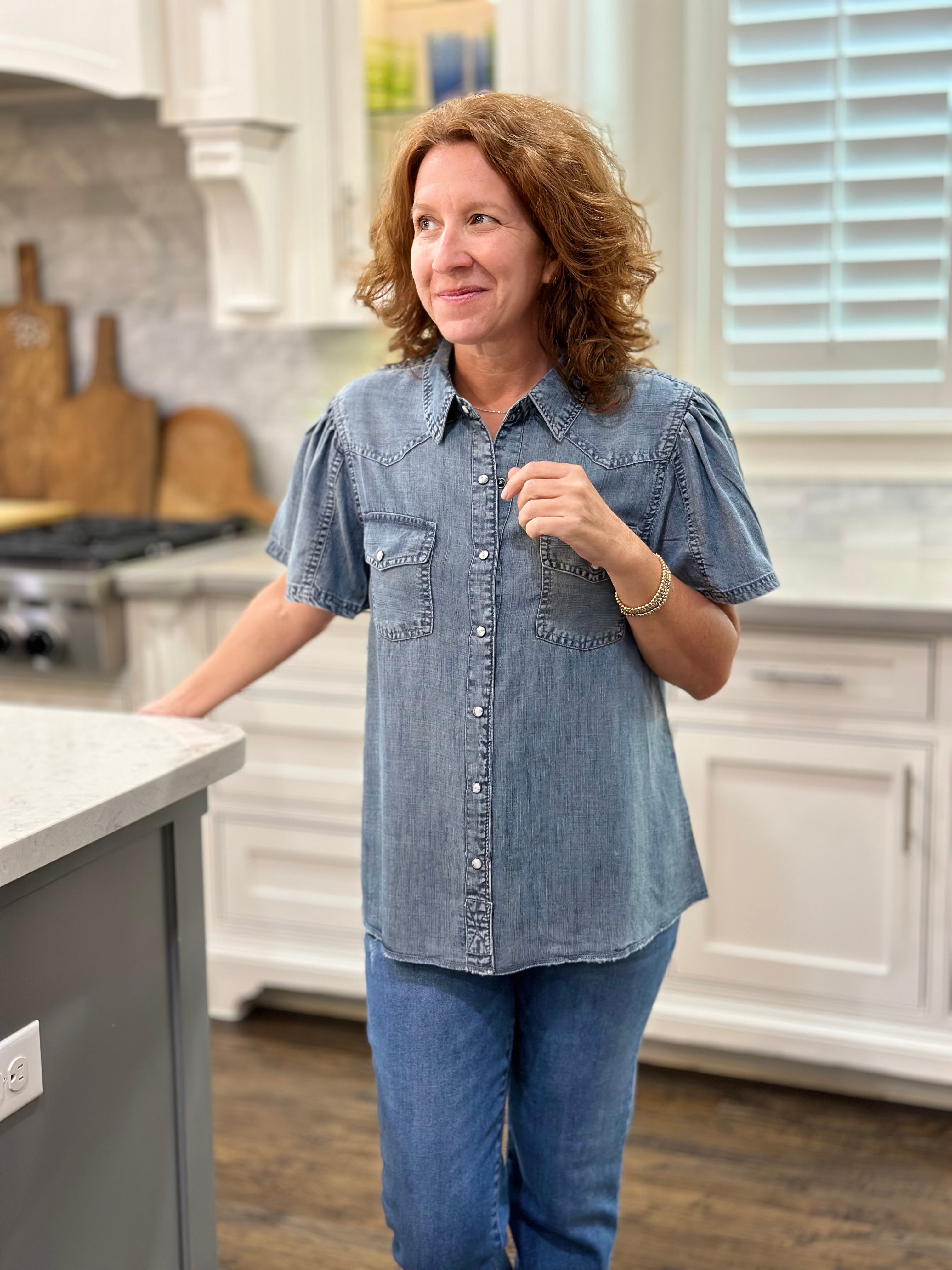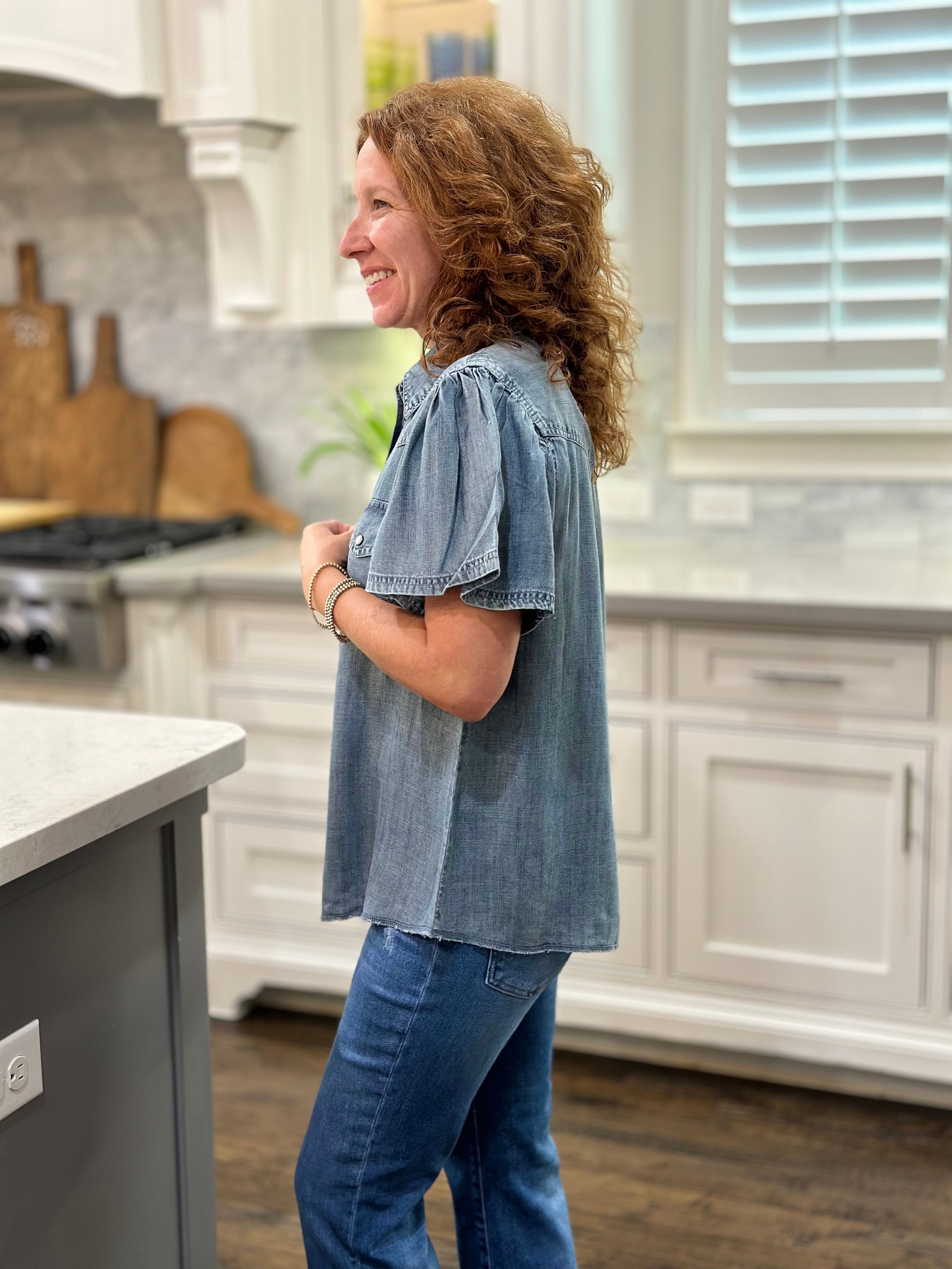 Pearl snaps and short flutter sleeves make this blouse a fun addition to your closet.  Shirttail hem (slightly shorter in the front) and easy fit will make this blouse your go to all season long.  Hits at hip for great coverage.