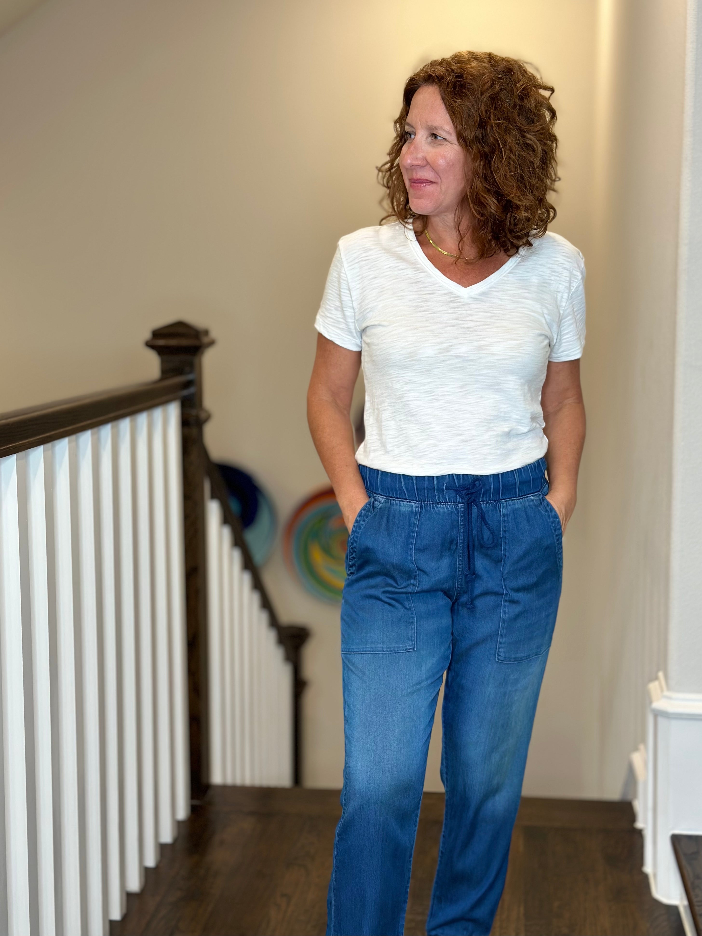 The Pocket Jogger is an everyday pant with a drawstring waist, cuffed ankles and side and back pockets. We love how versatile they are, no doubt these will become a staple in your closet! Made with 60% TENCEL™ Lyocell, 38% Cotton, 2% Spandex.