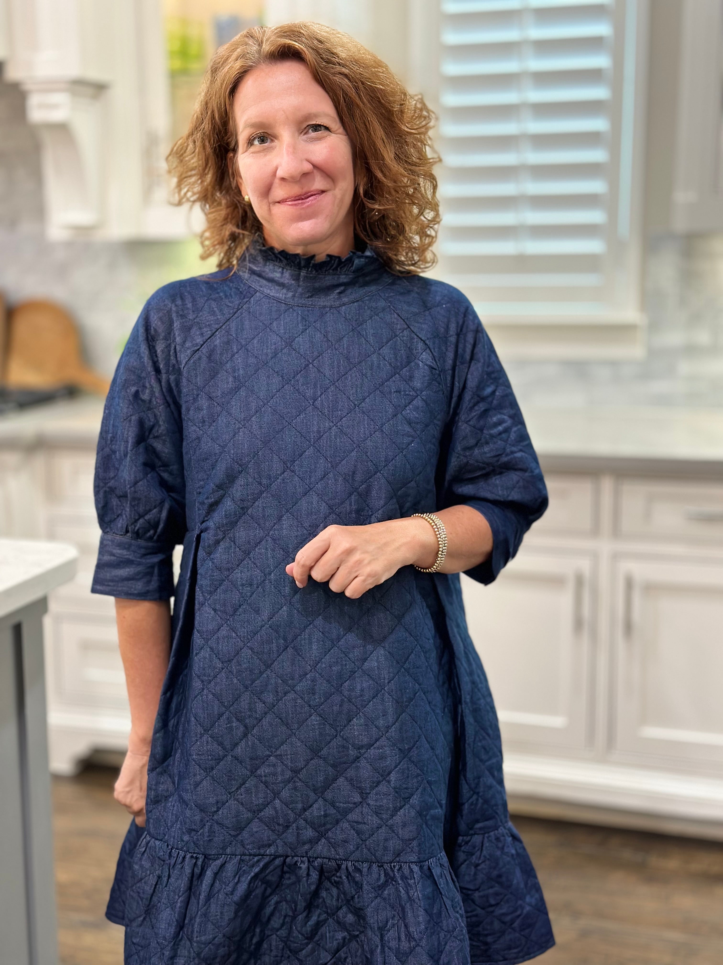 Soft quilted denim make this dress an easy option to wear with sneaks, boots, flats or heels. Easily dress up or down. Pockets and keyhole button detailing on the back add to the comfort.