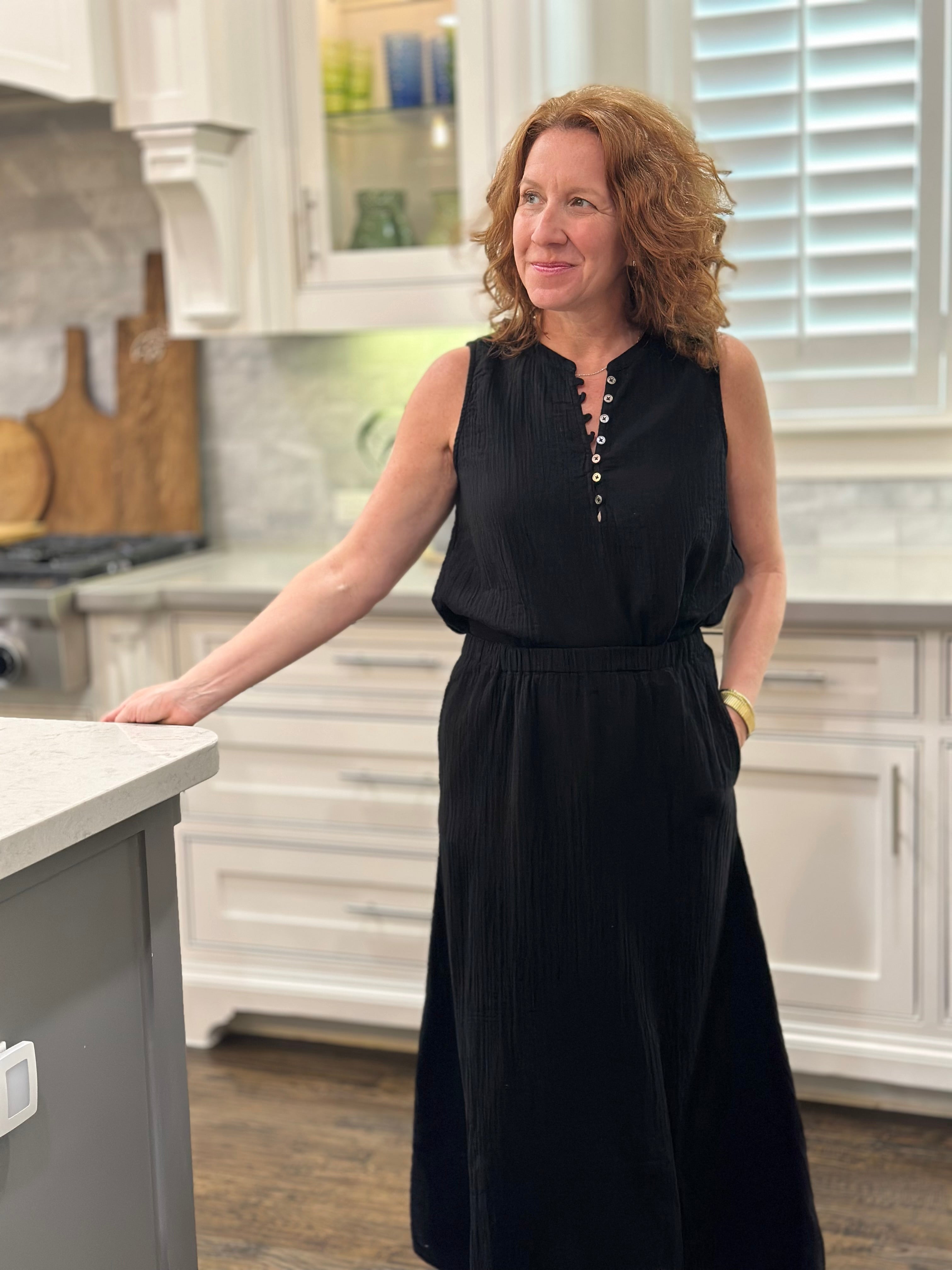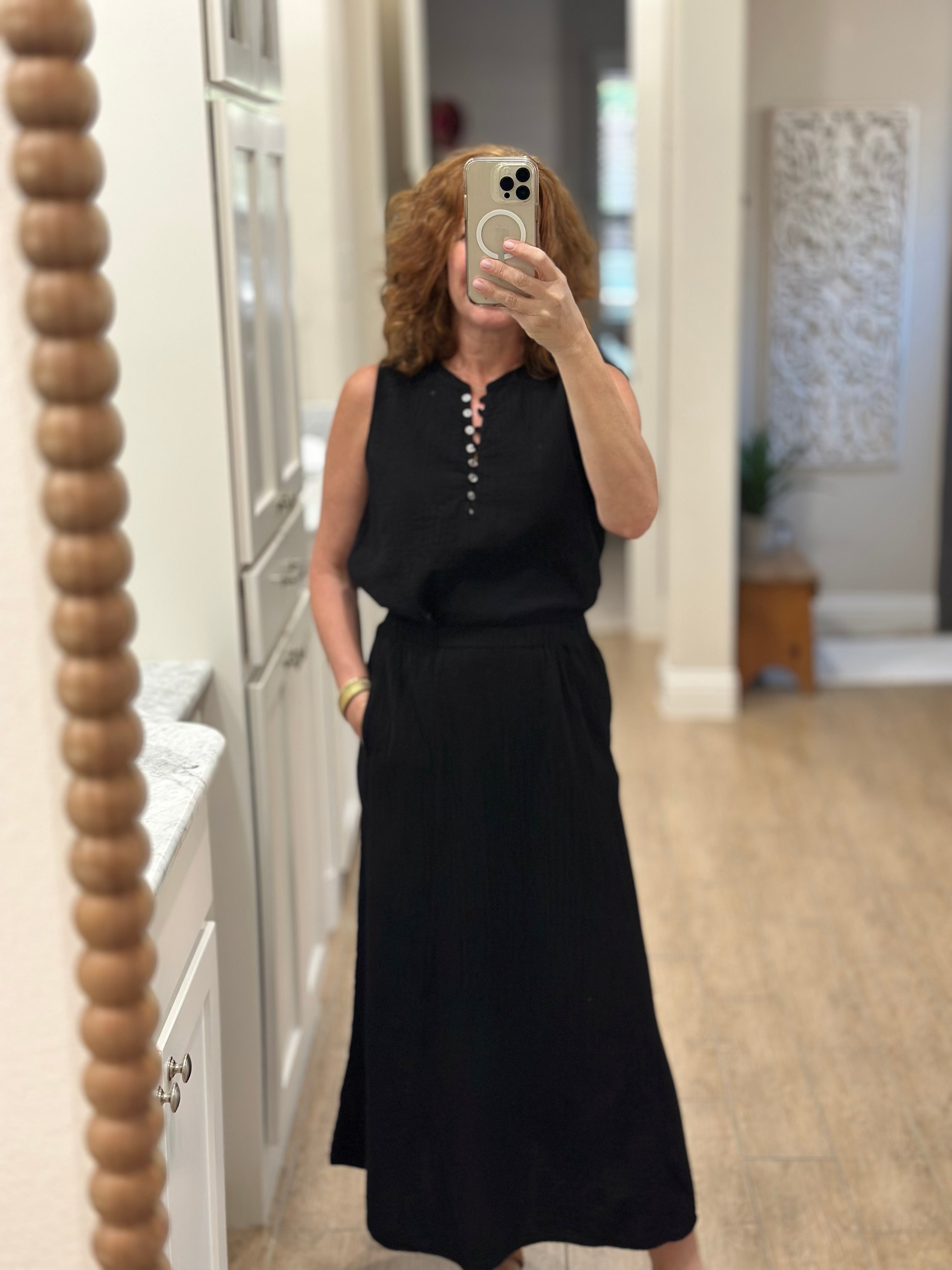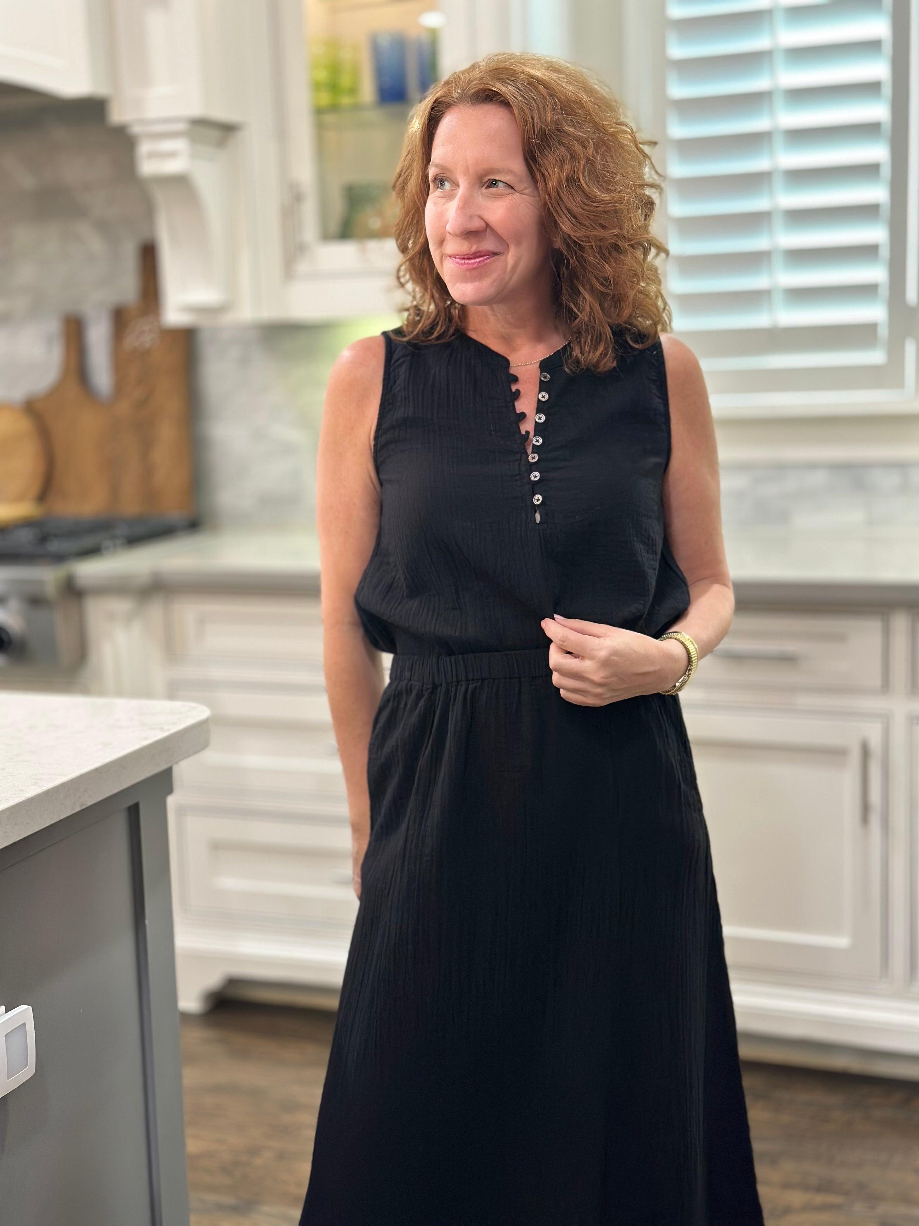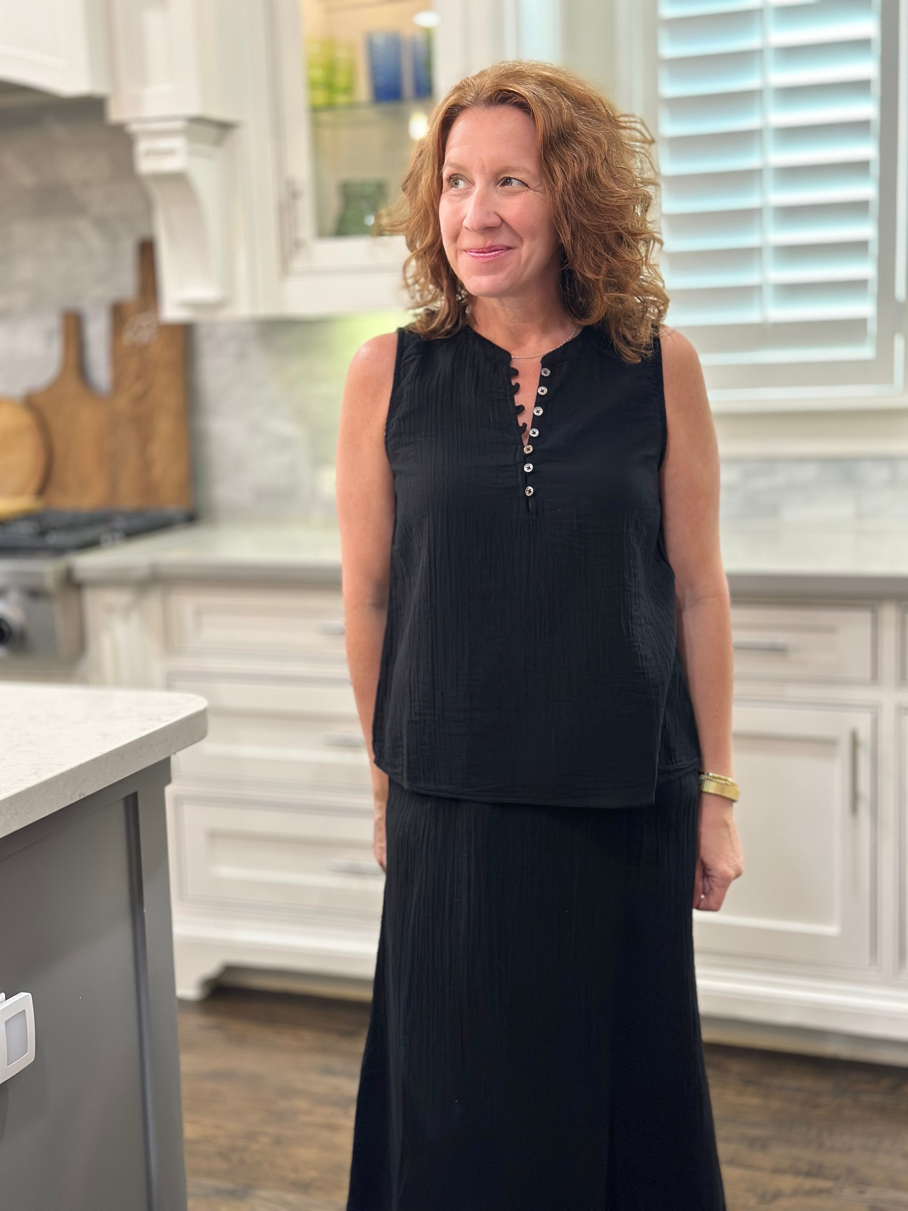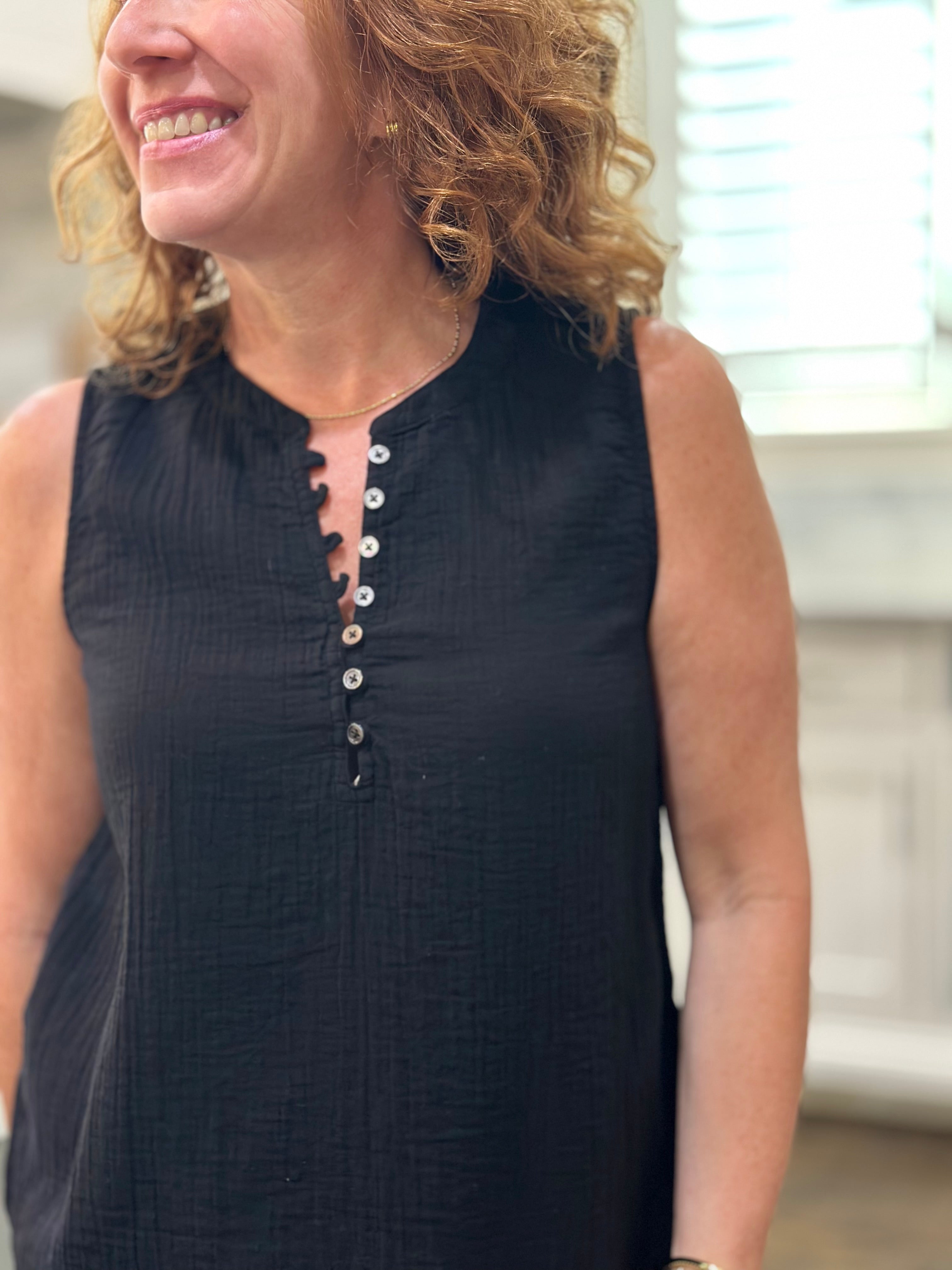 Enhance your spring and summer wardrobe with the Andi Sleeveless Top. This timeless and effortless top features a half button down front and a shirttail hem that hits at the hip for optimal coverage and style.
