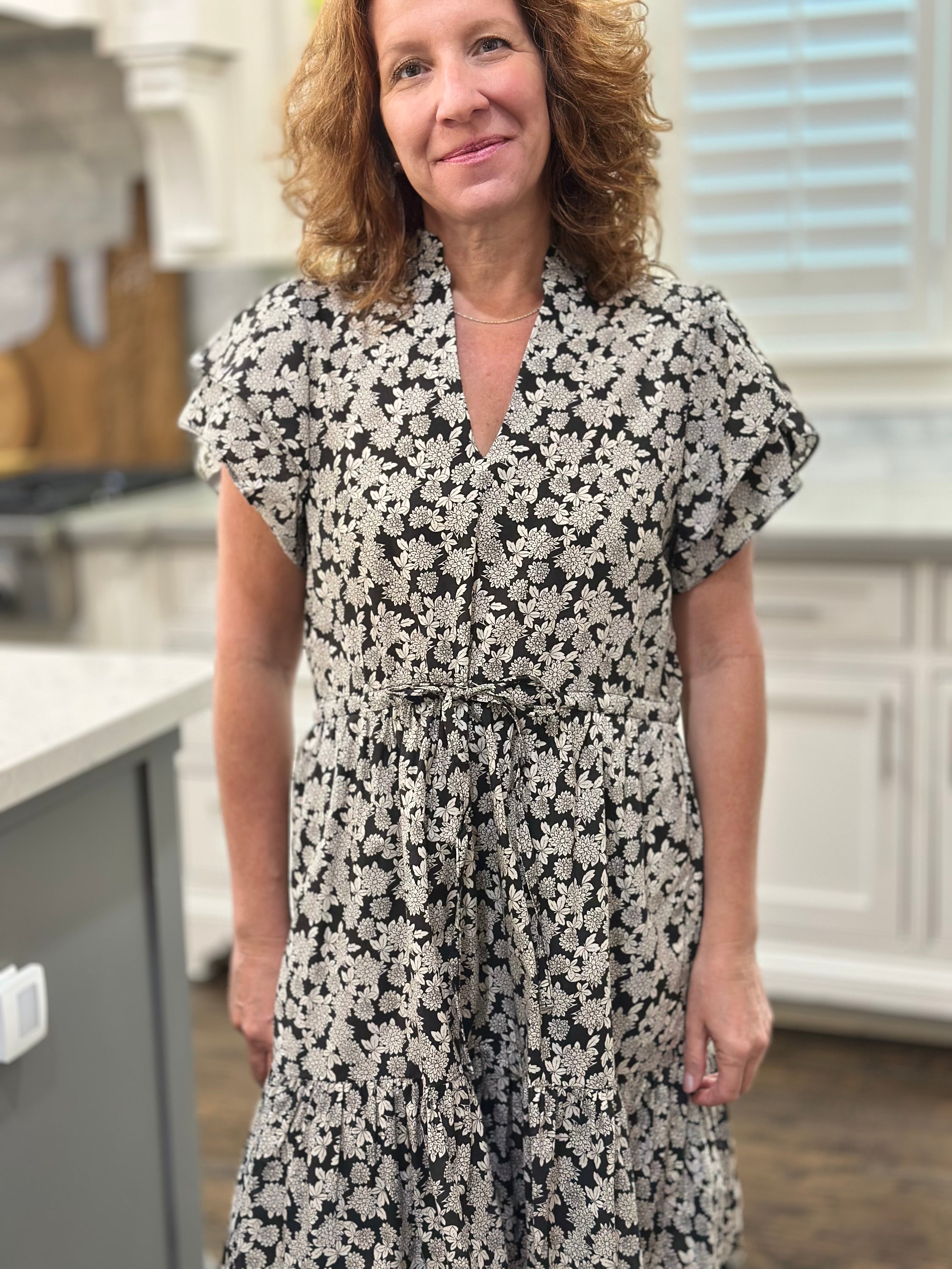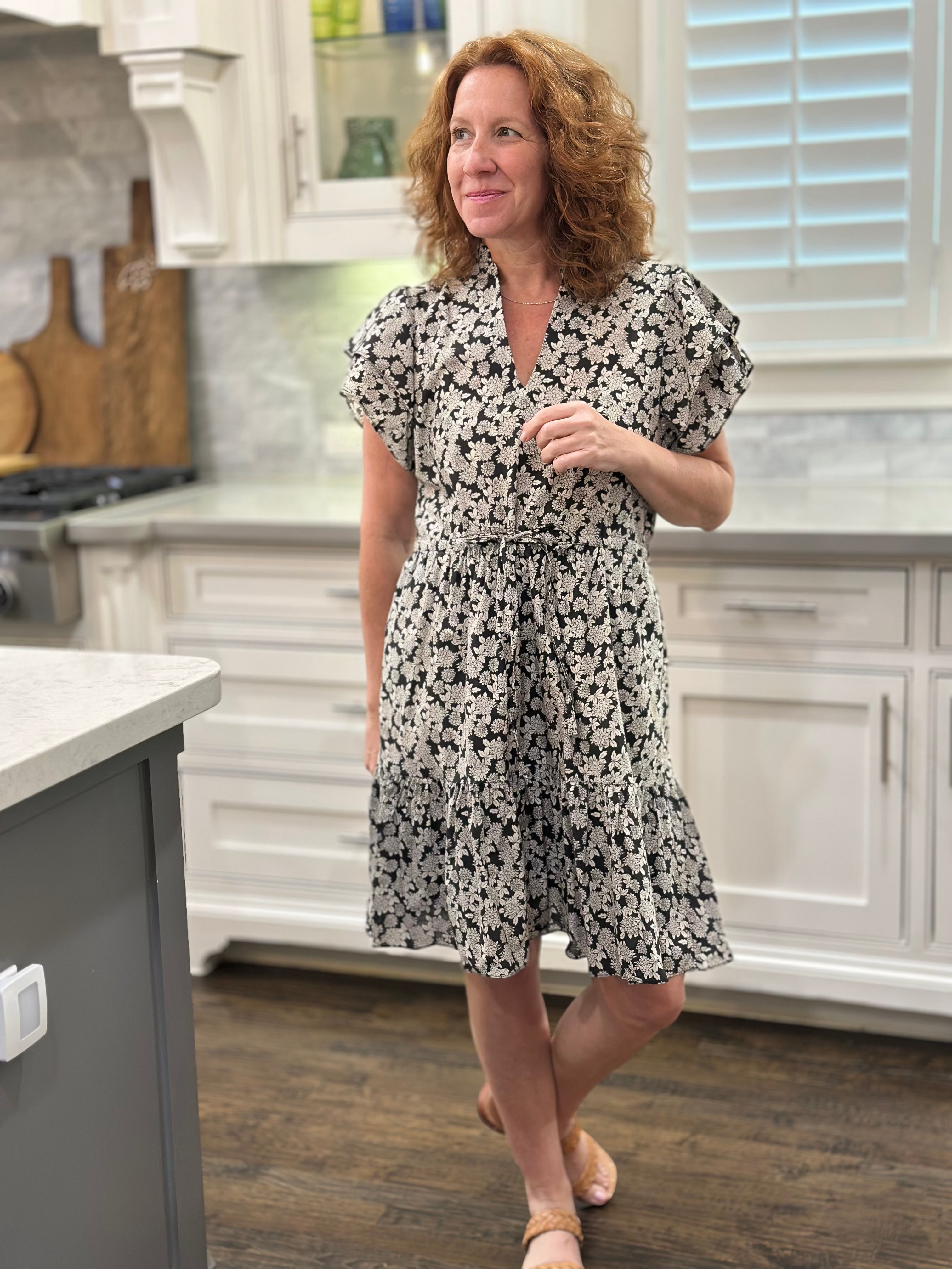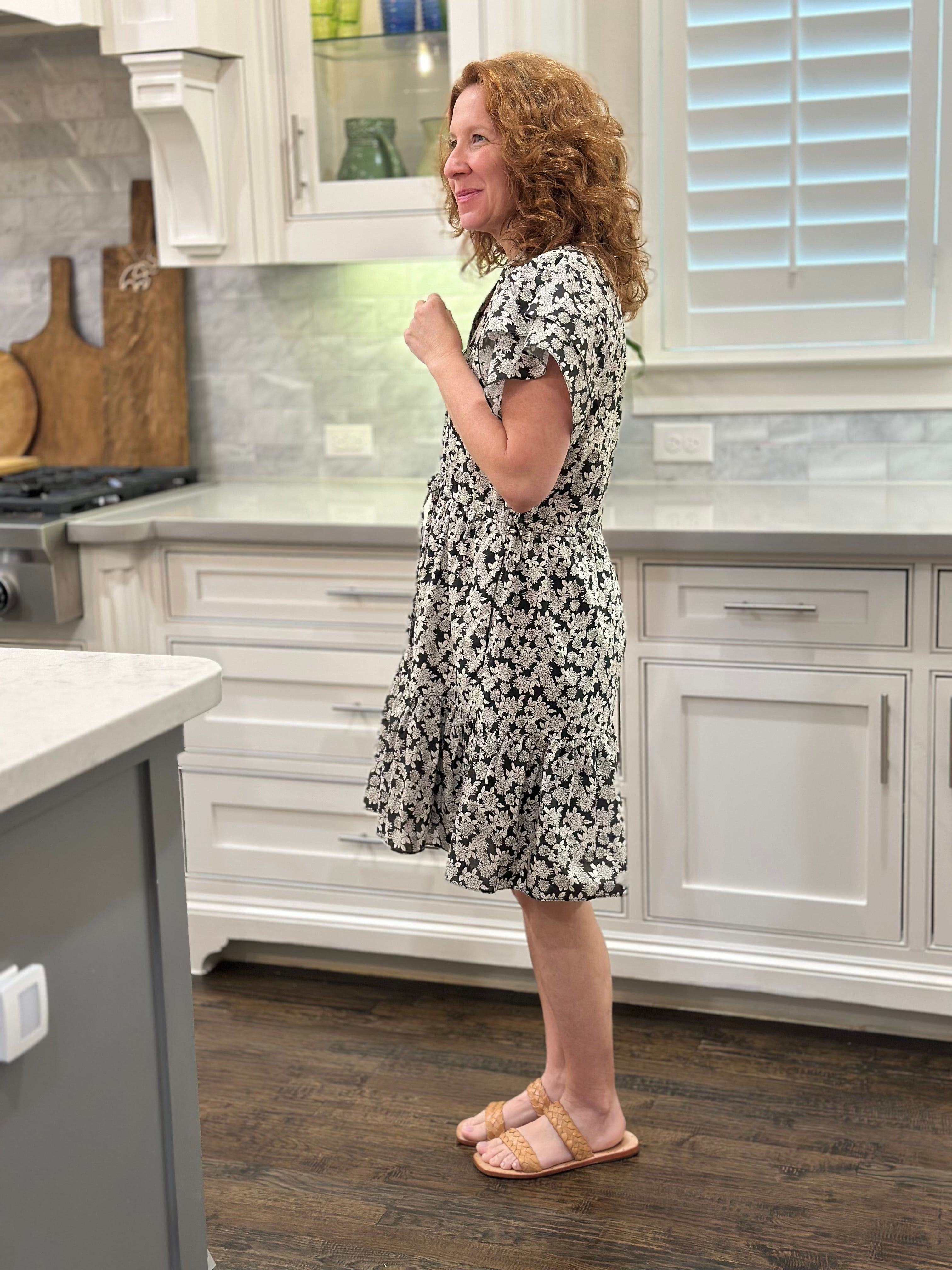 This stylish cotton dress is a versatile addition to any wardrobe. Its lightweight and flowy body offers a comfortable and flattering fit, while its practical pockets and stretchy waist make it both functional and fashionable.