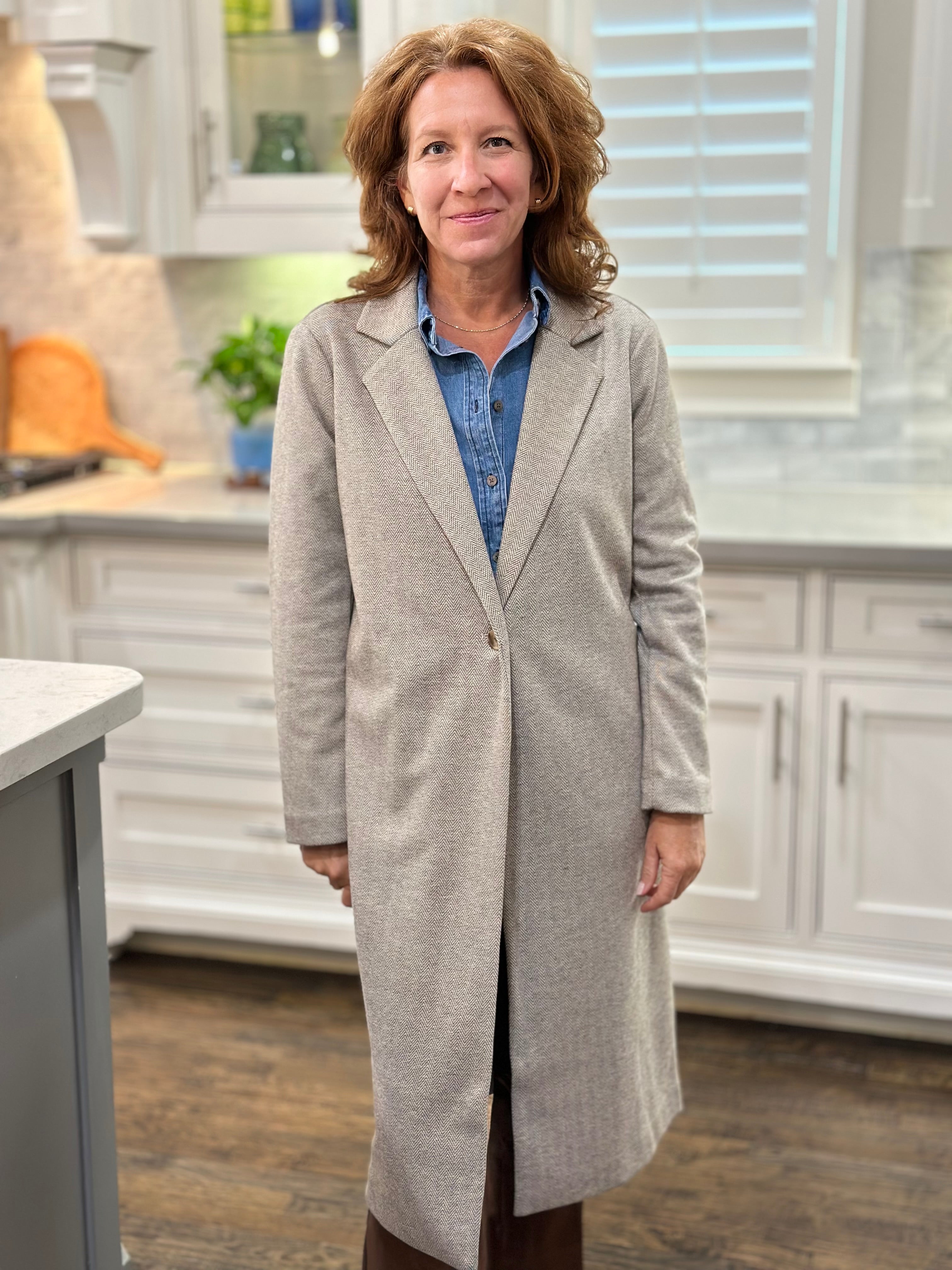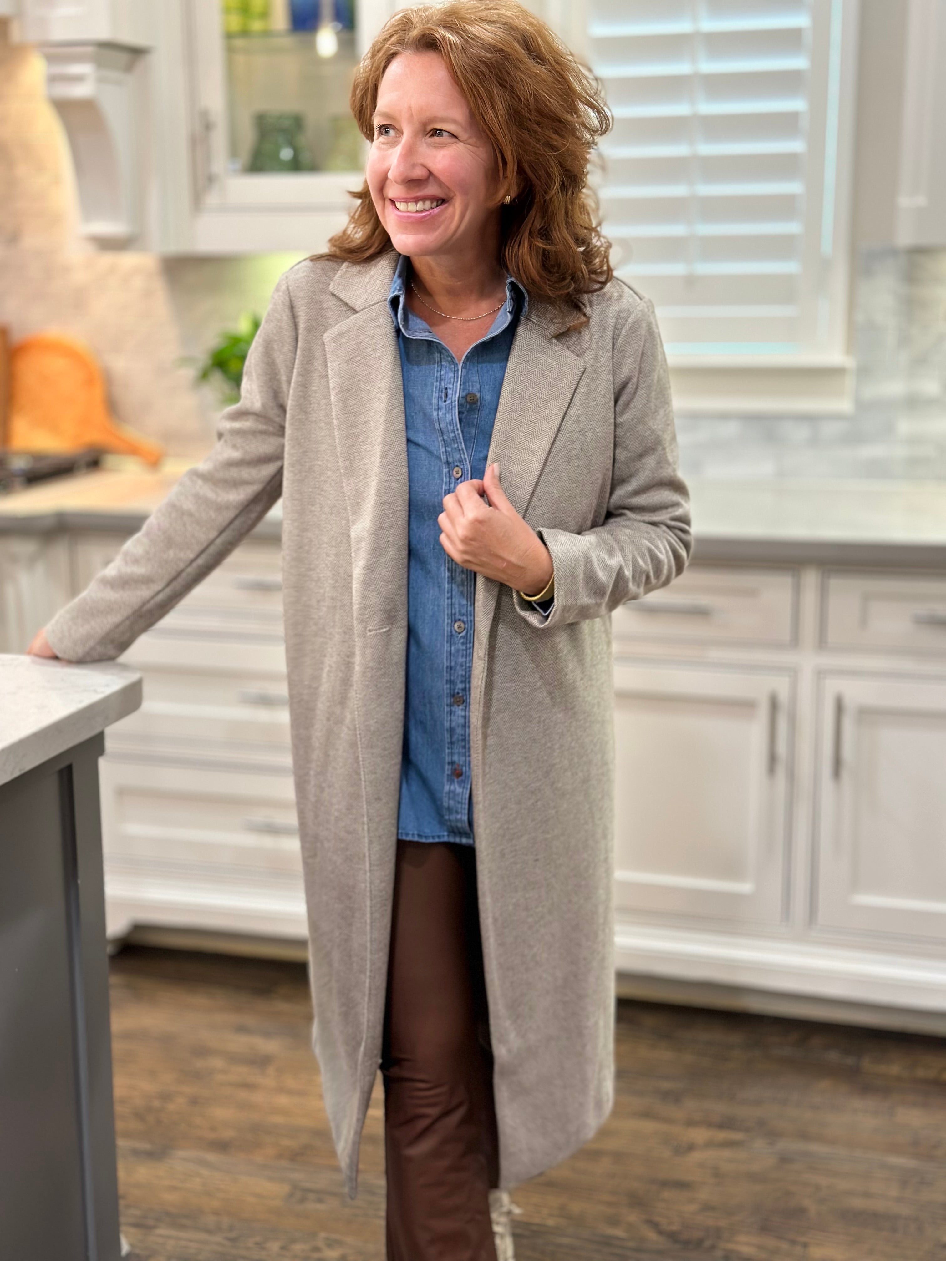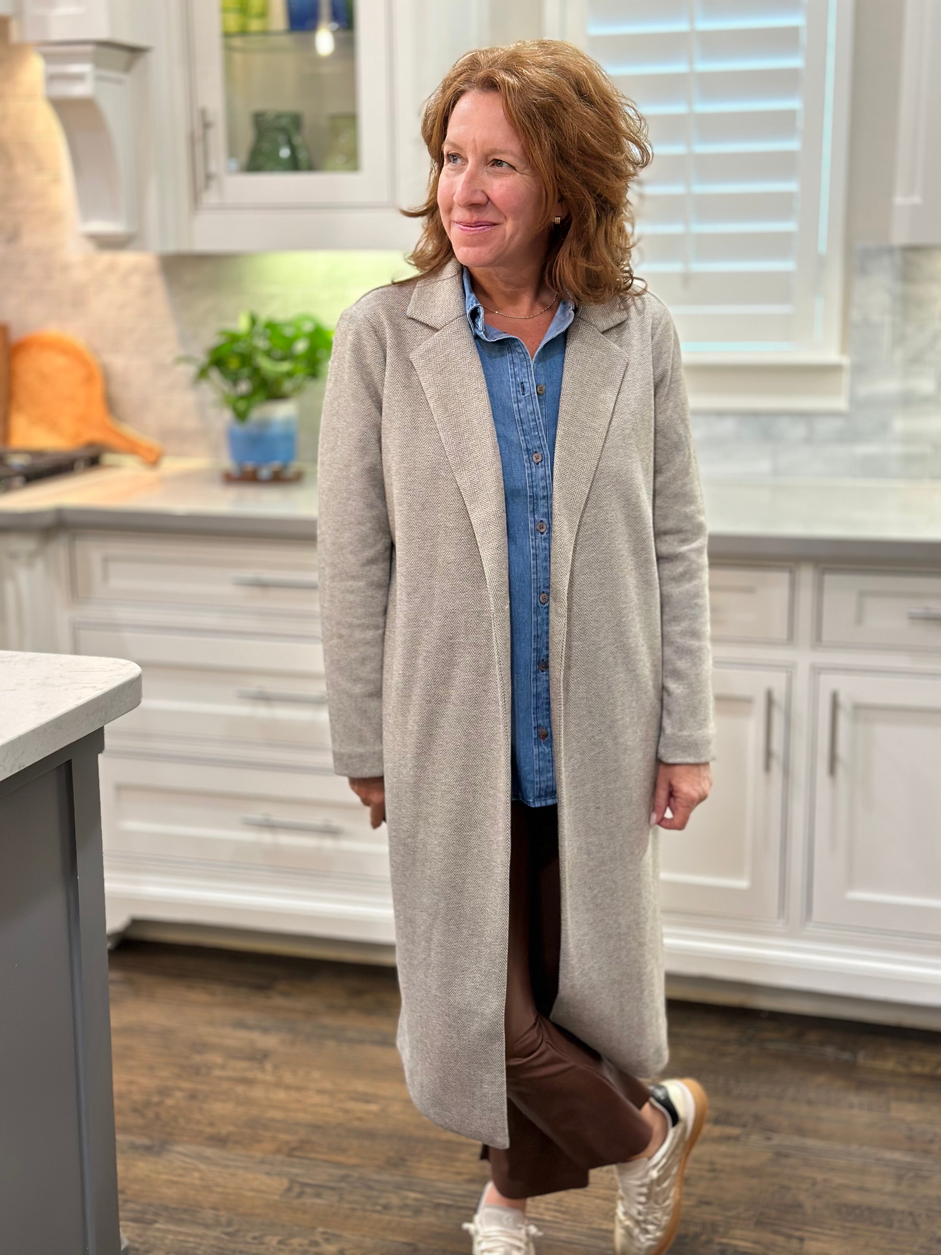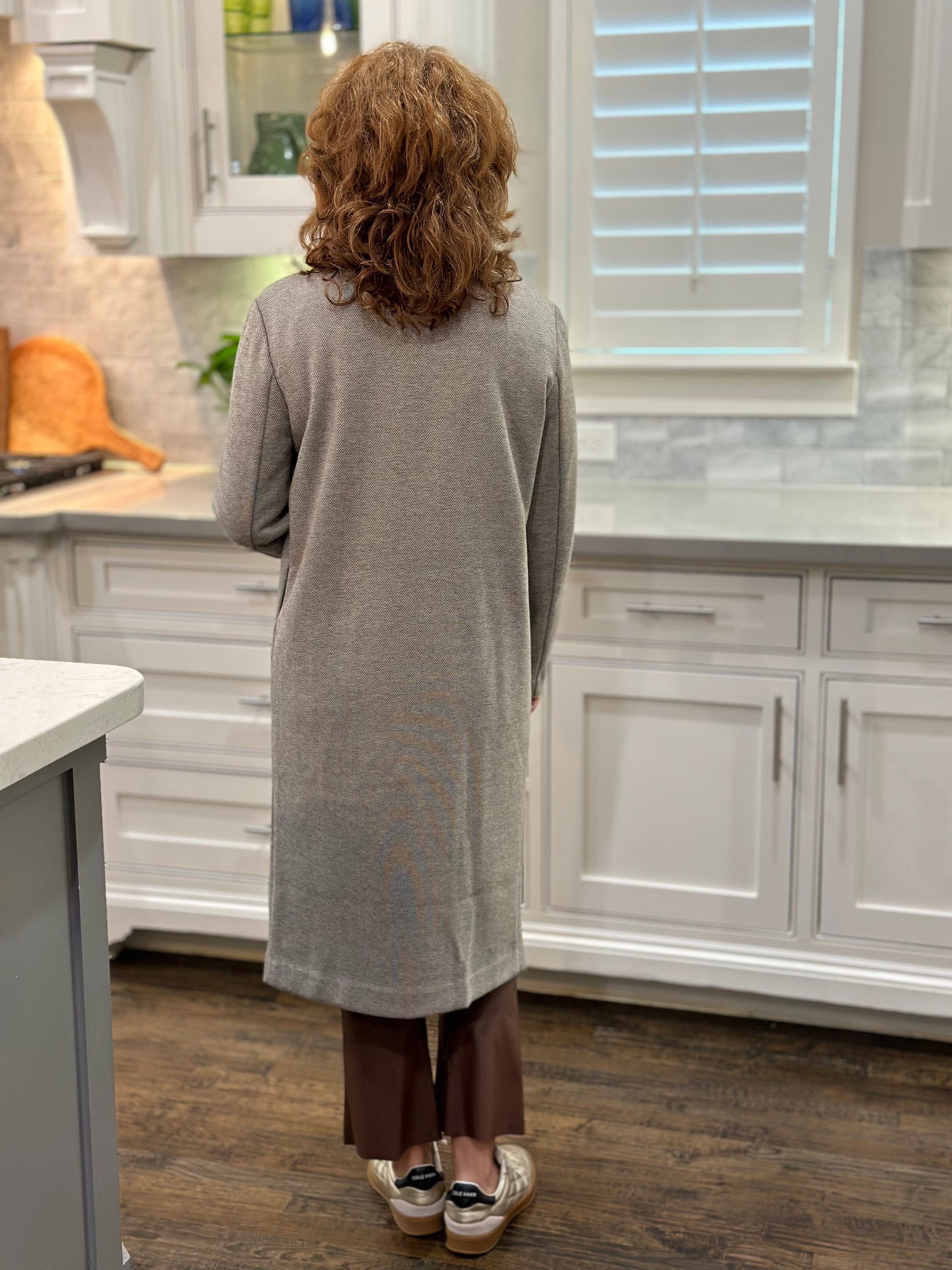 Beautiful soft, long sleeved knit coat. Single button down front, classic shirt style and pockets make this piece a go-to to throw on all season.