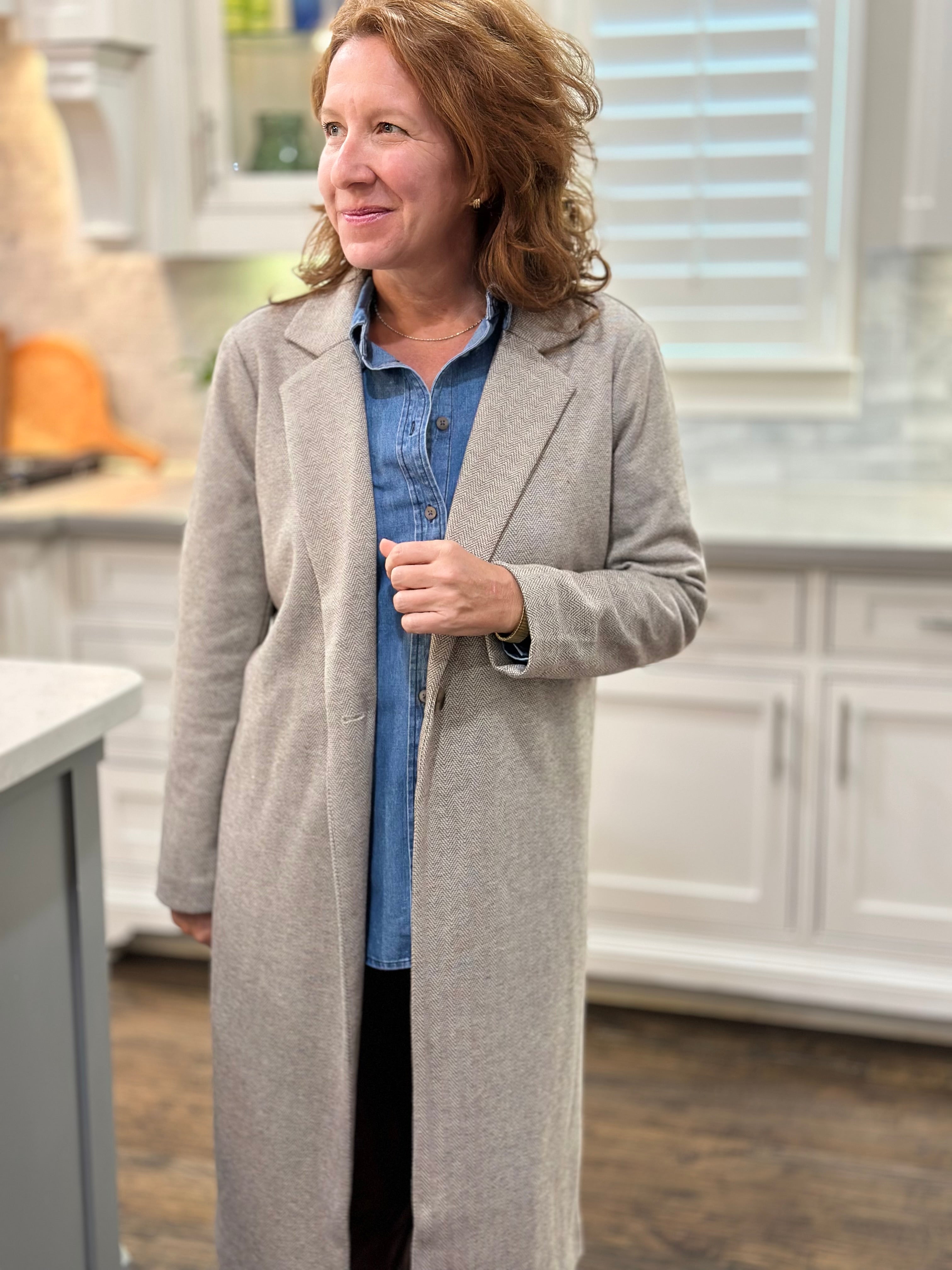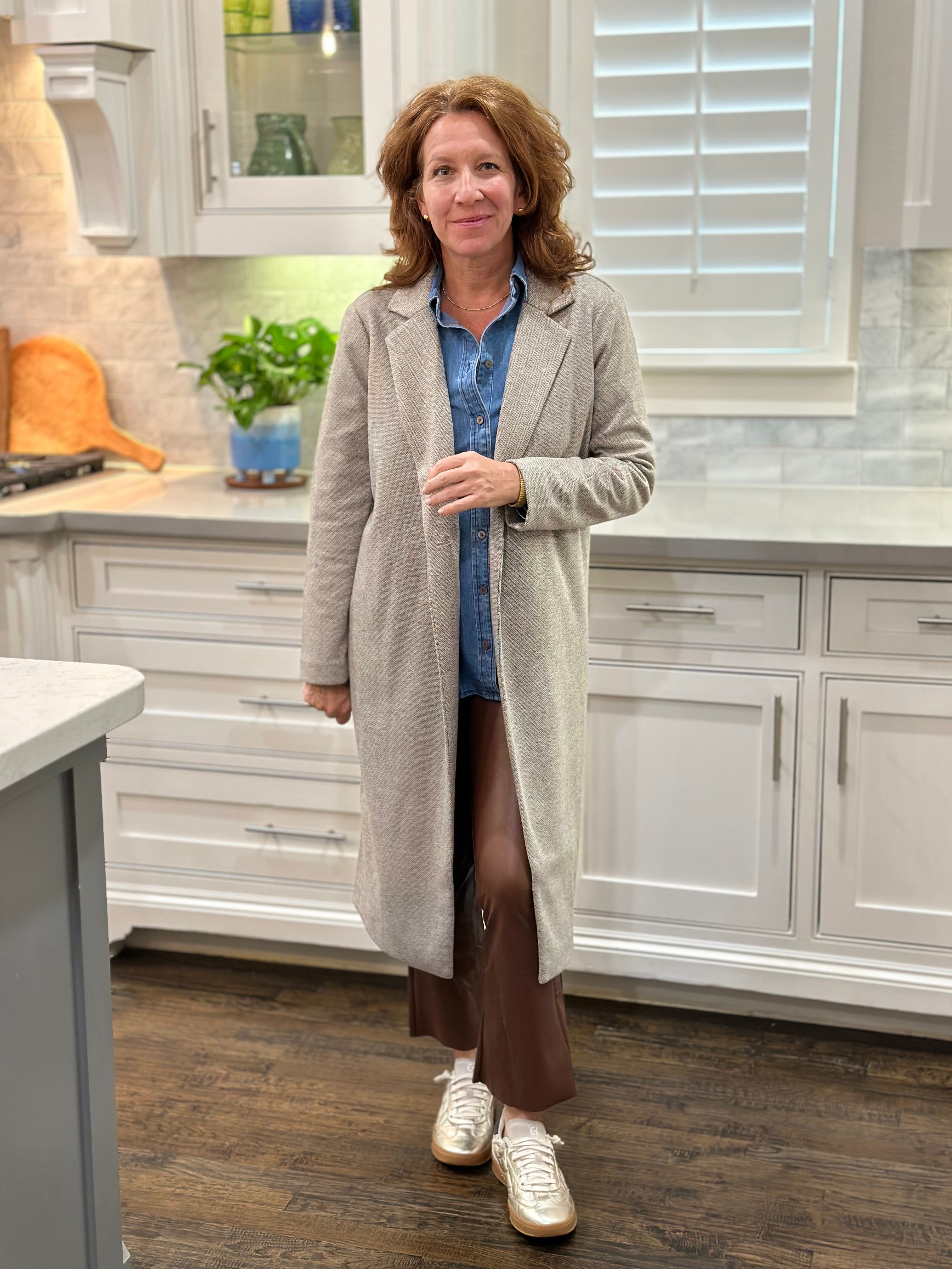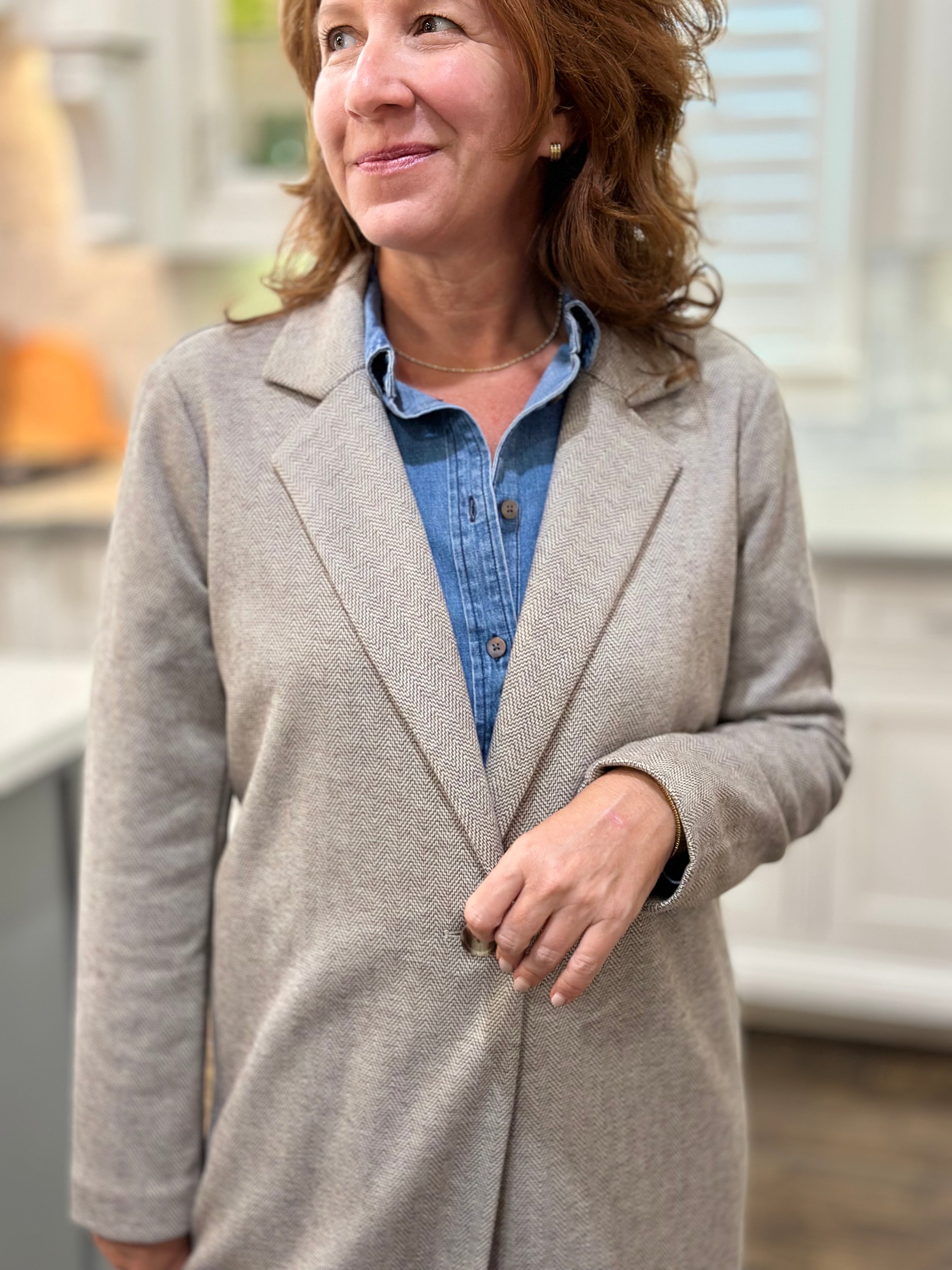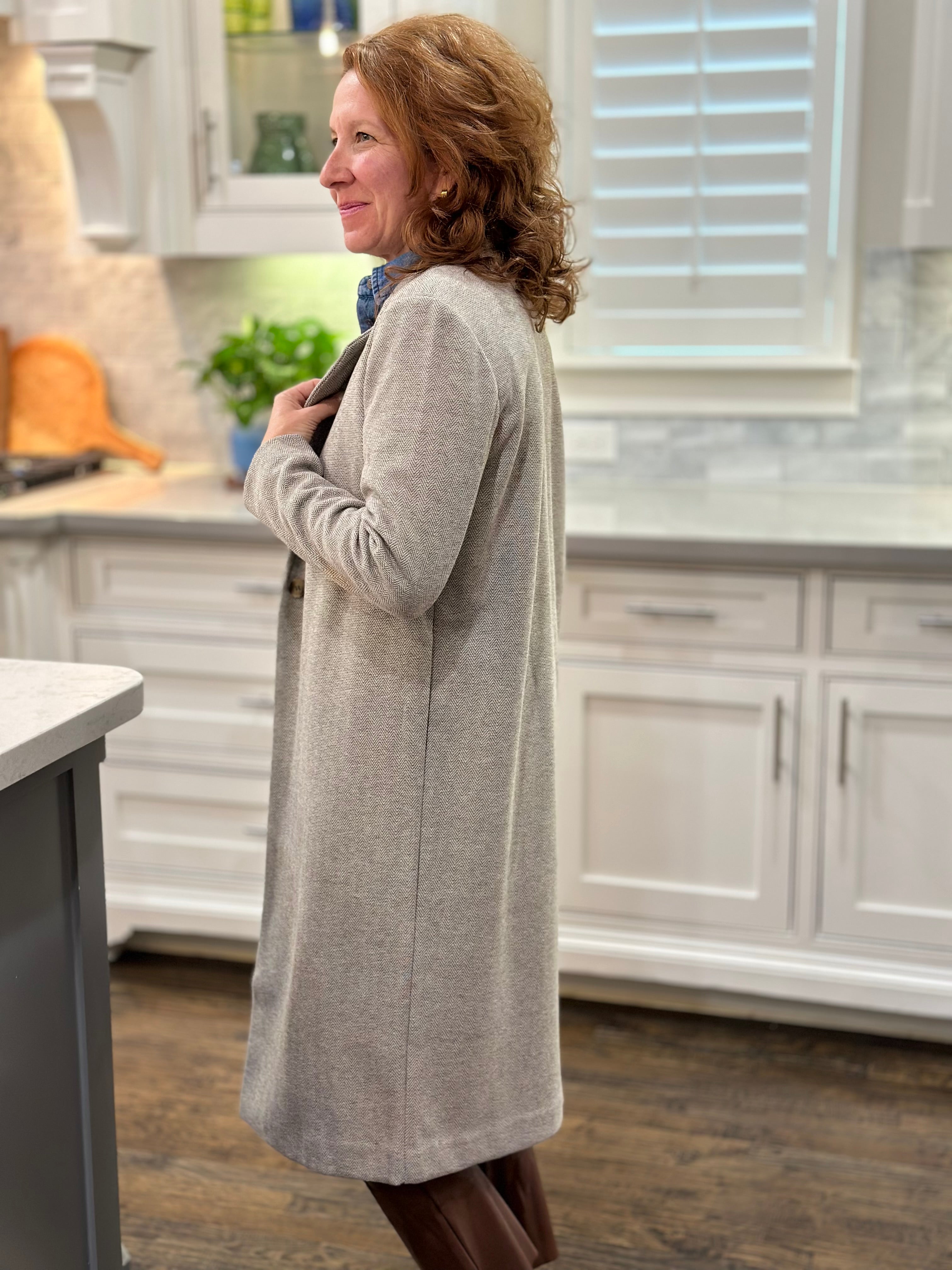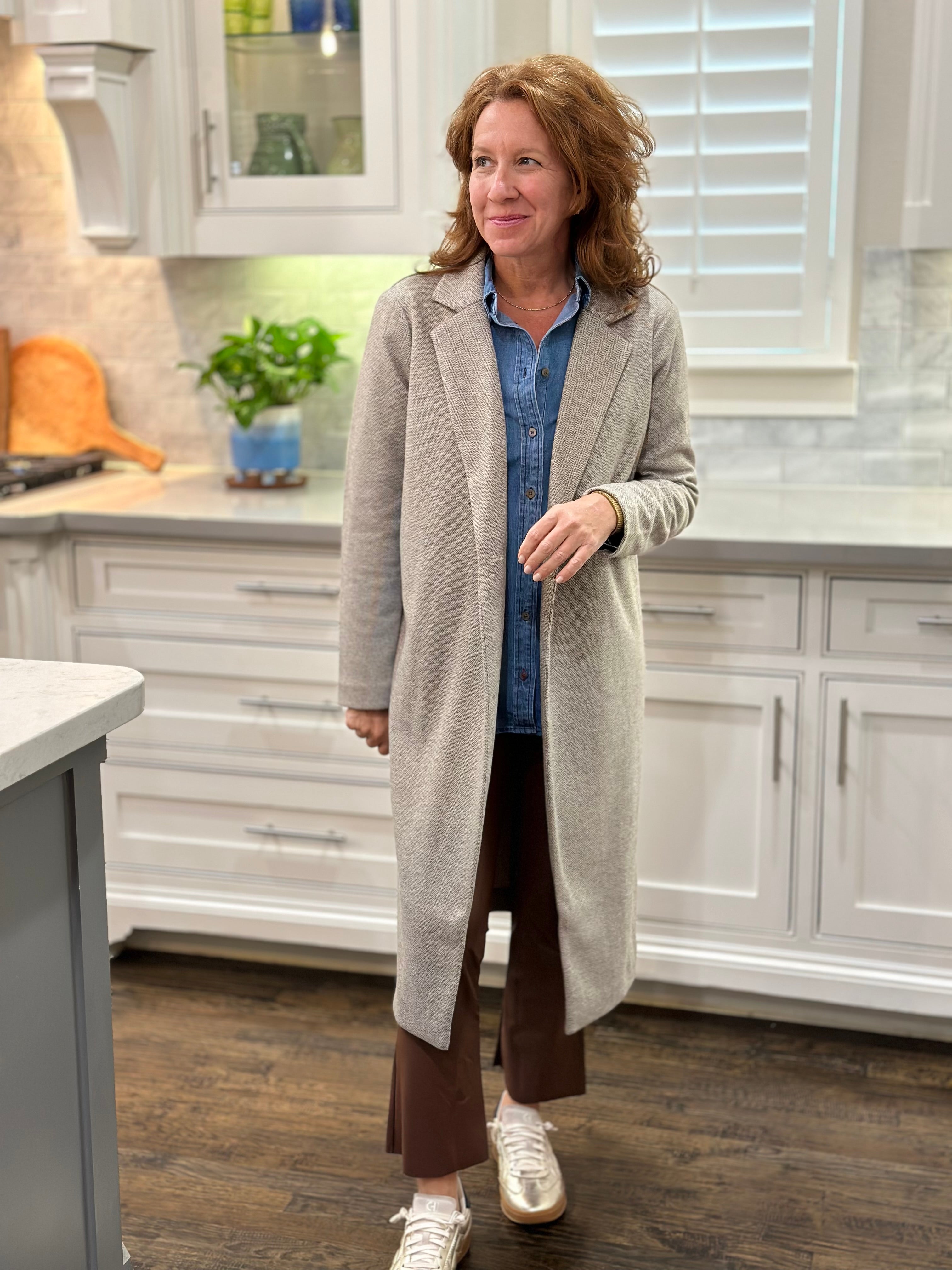 Beautiful soft, long sleeved knit coat. Single button down front, classic shirt style and pockets make this piece a go-to to throw on all season.