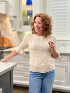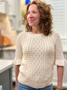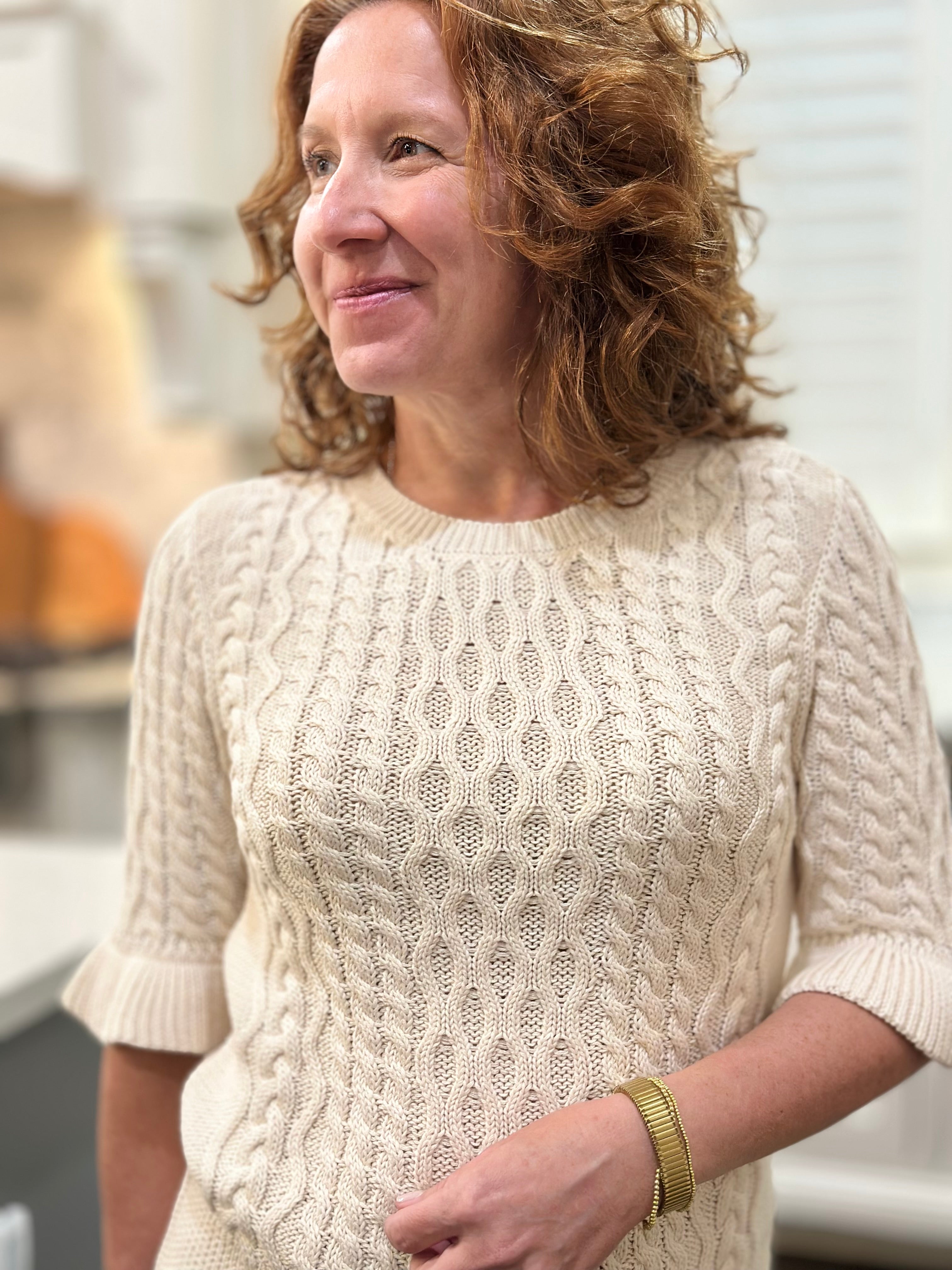 A classic cotton cable knit with ruffle sleeve detailing to add a feminine touch.