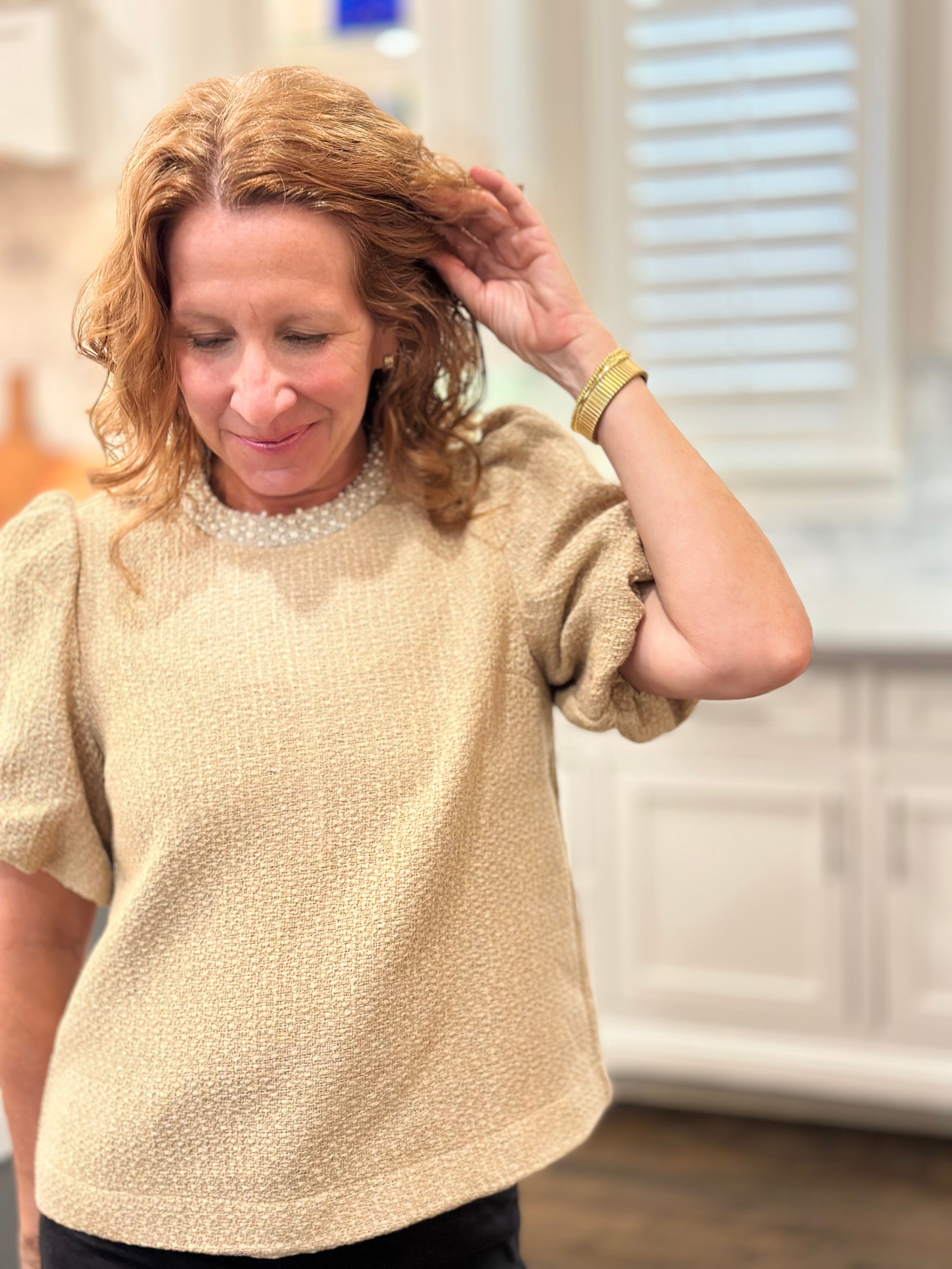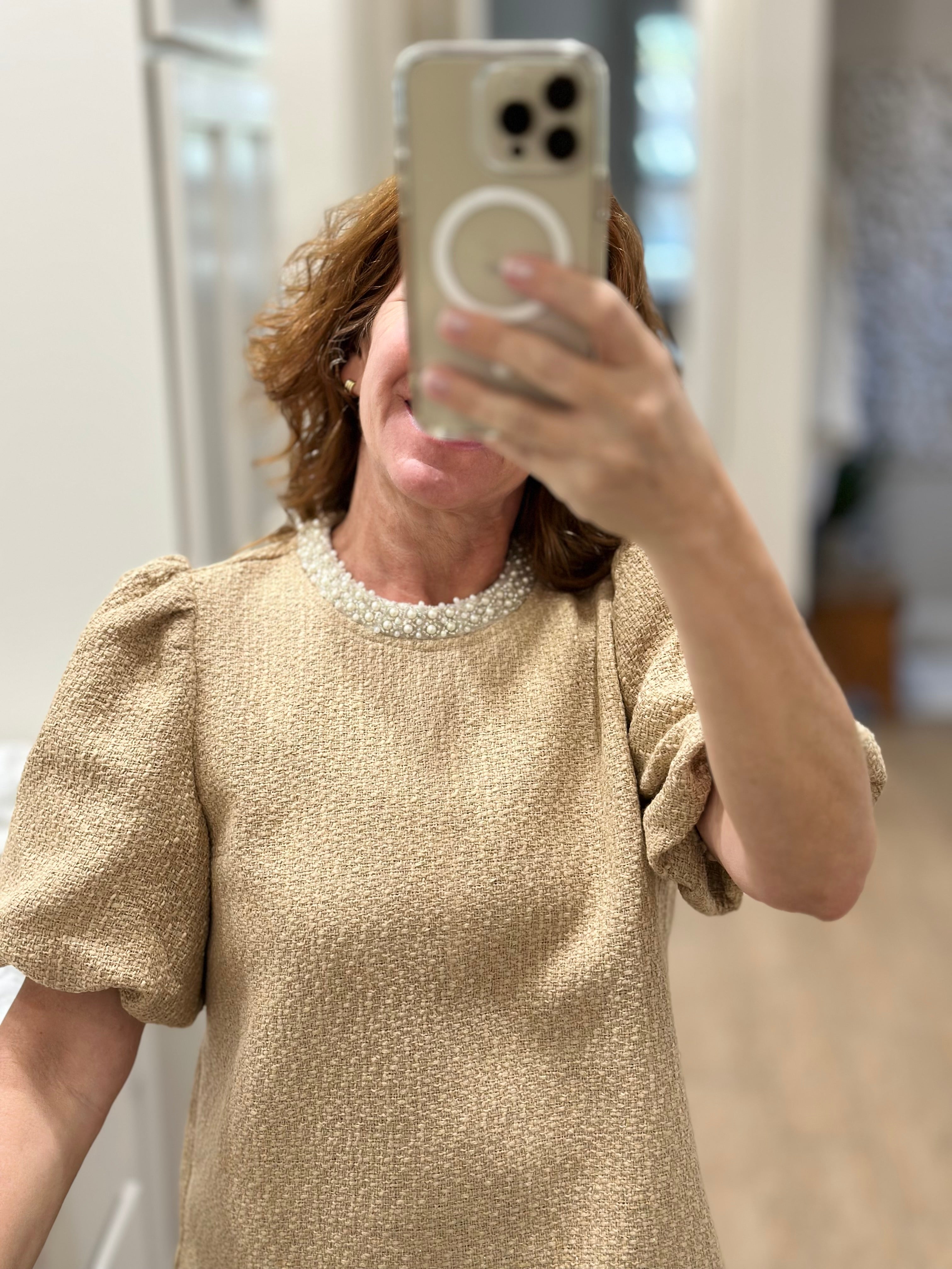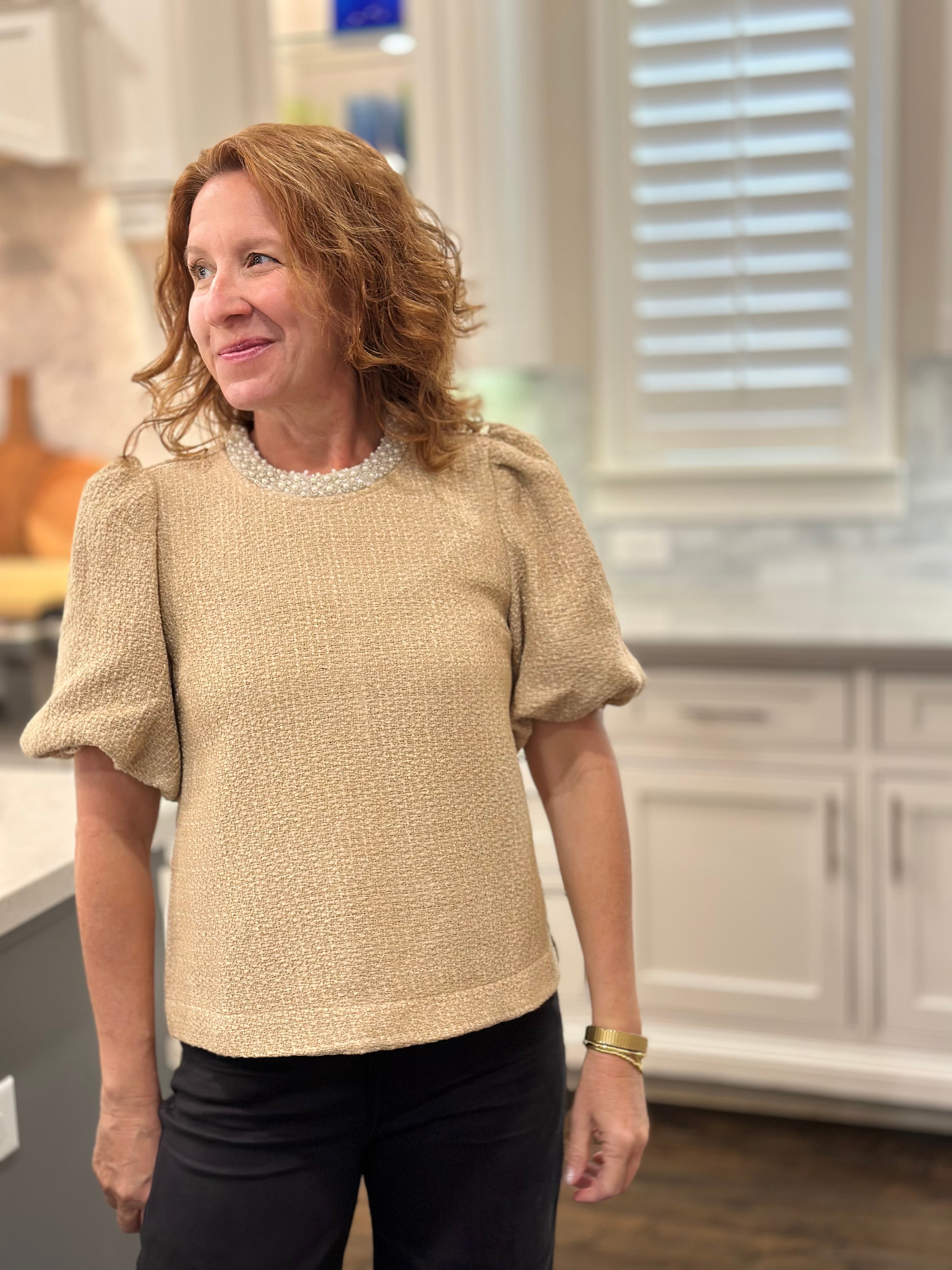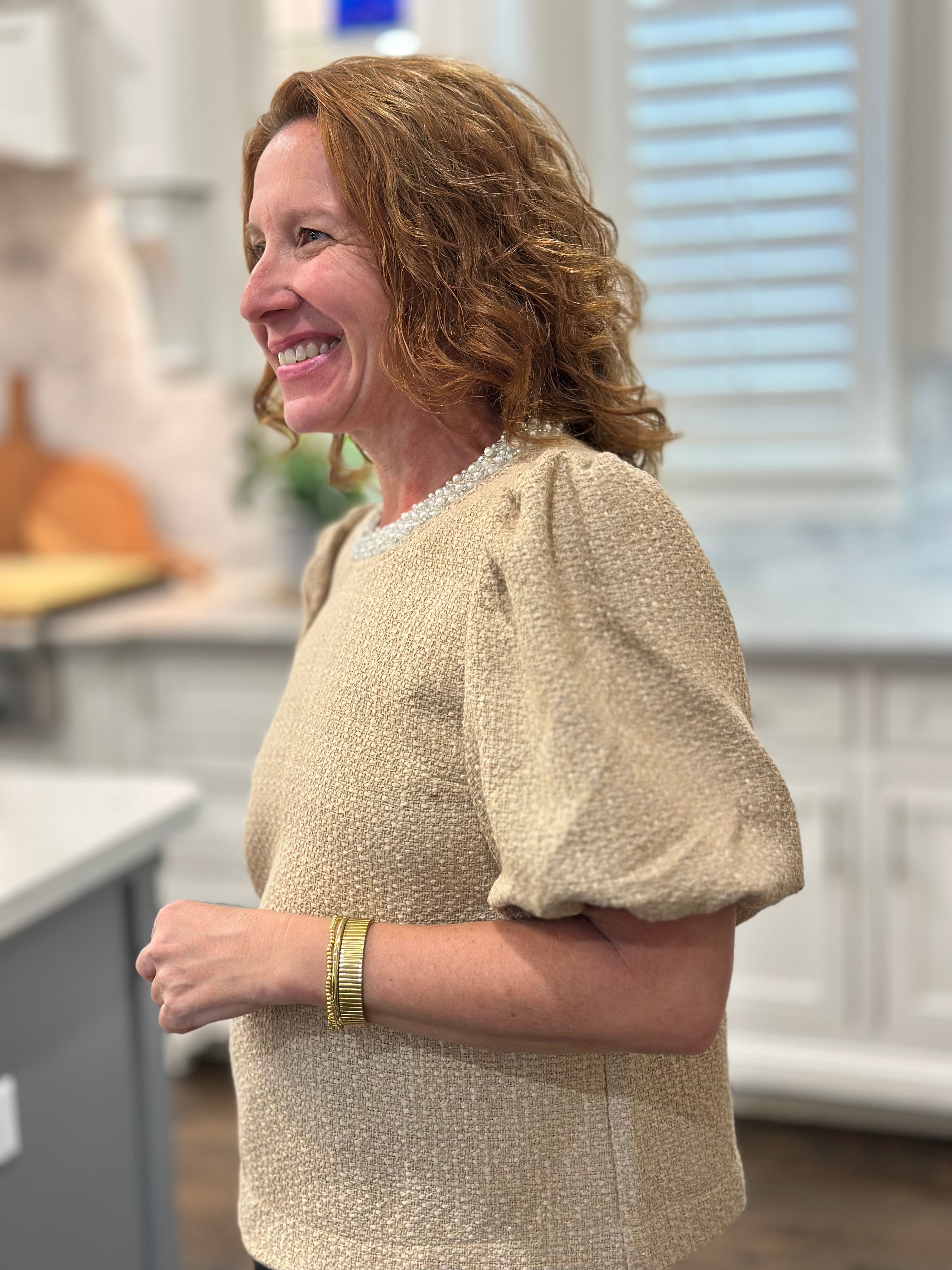 Get ready to steal the spotlight in this fabulous statement top that's bursting with personality. The intricate beaded neckline shimmers and shines, drawing all eyes upward, while the charming puff sleeves that taper at the elbow bring a delightful retro-meets-now vibe.