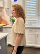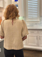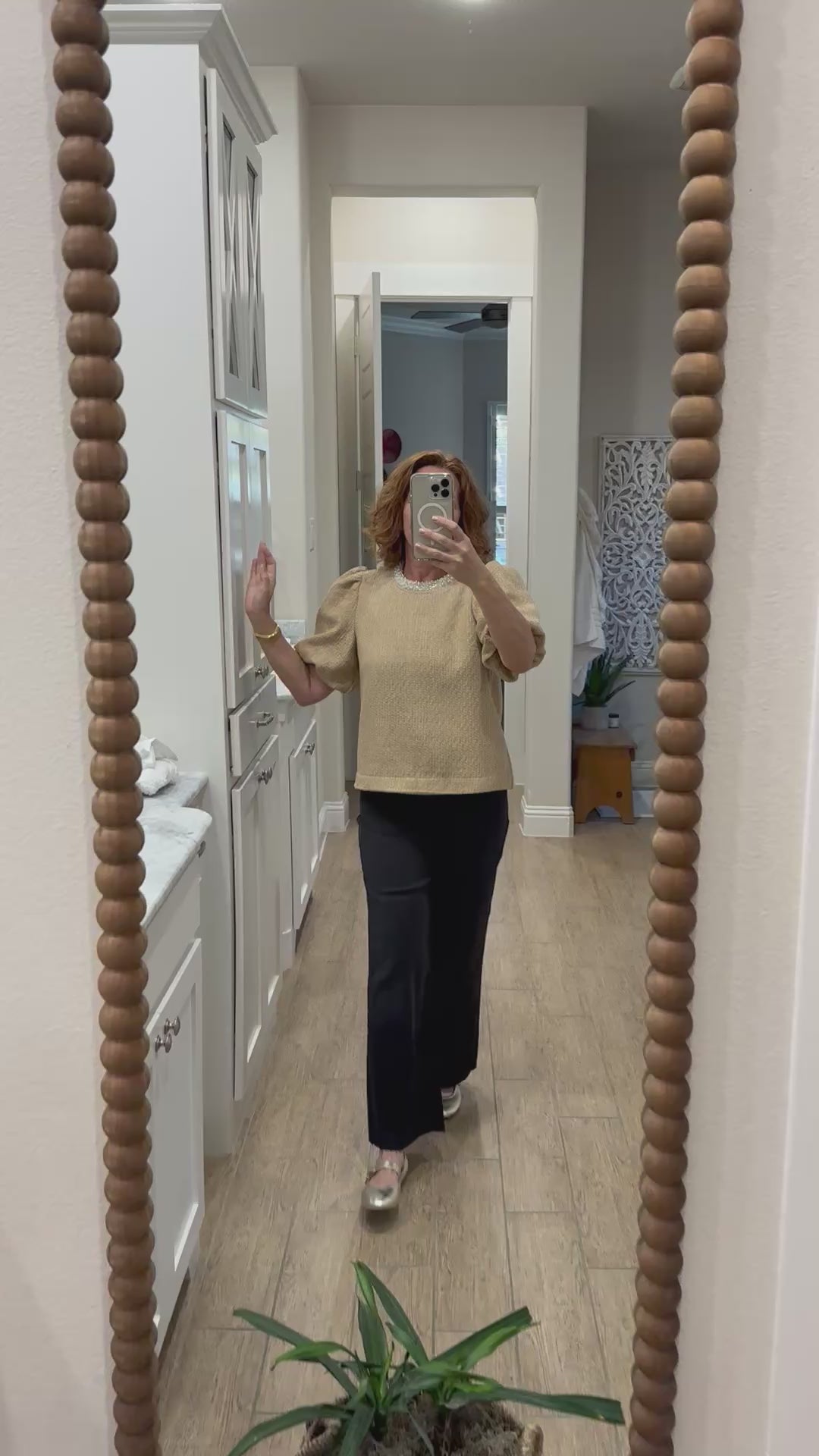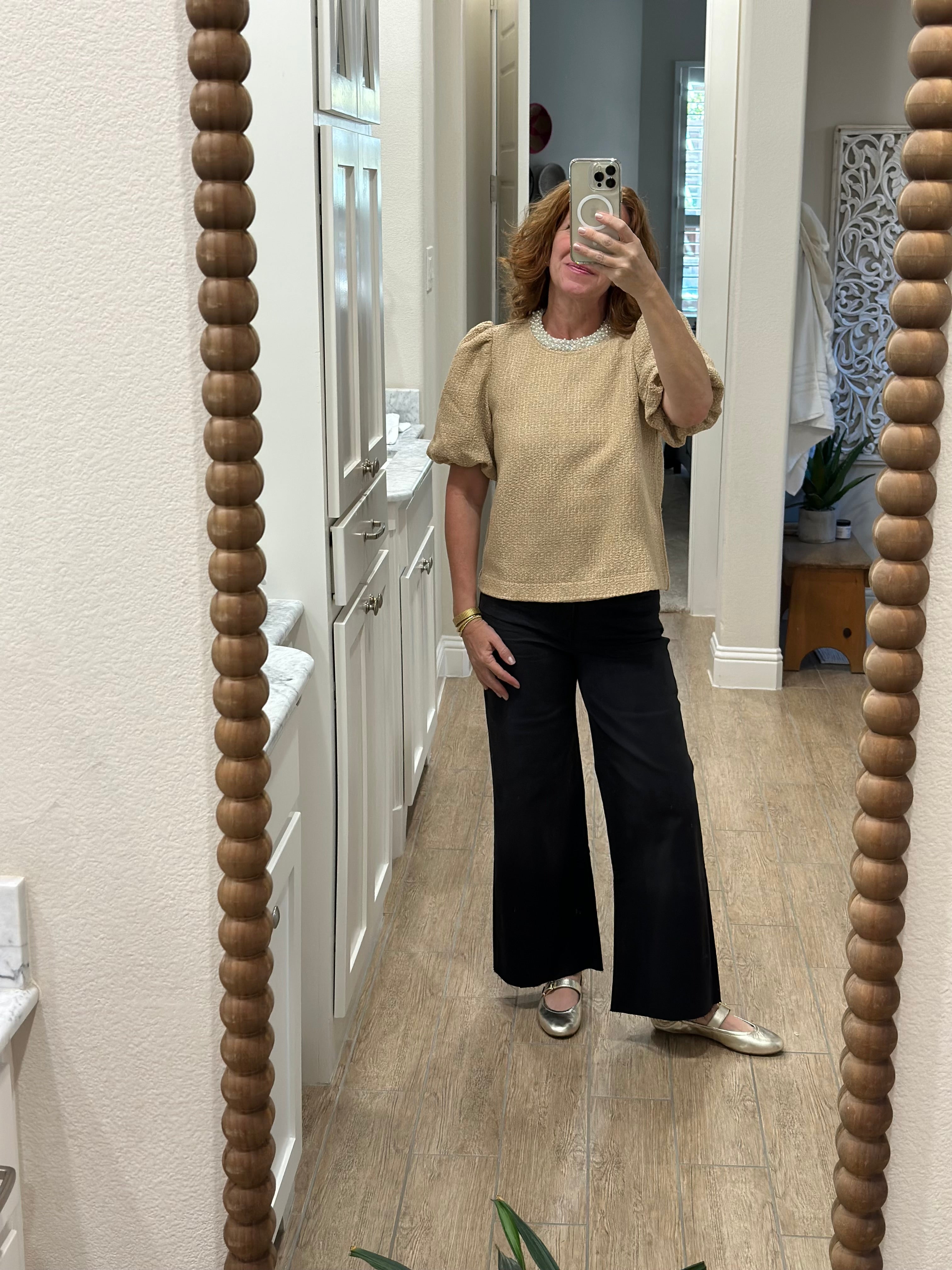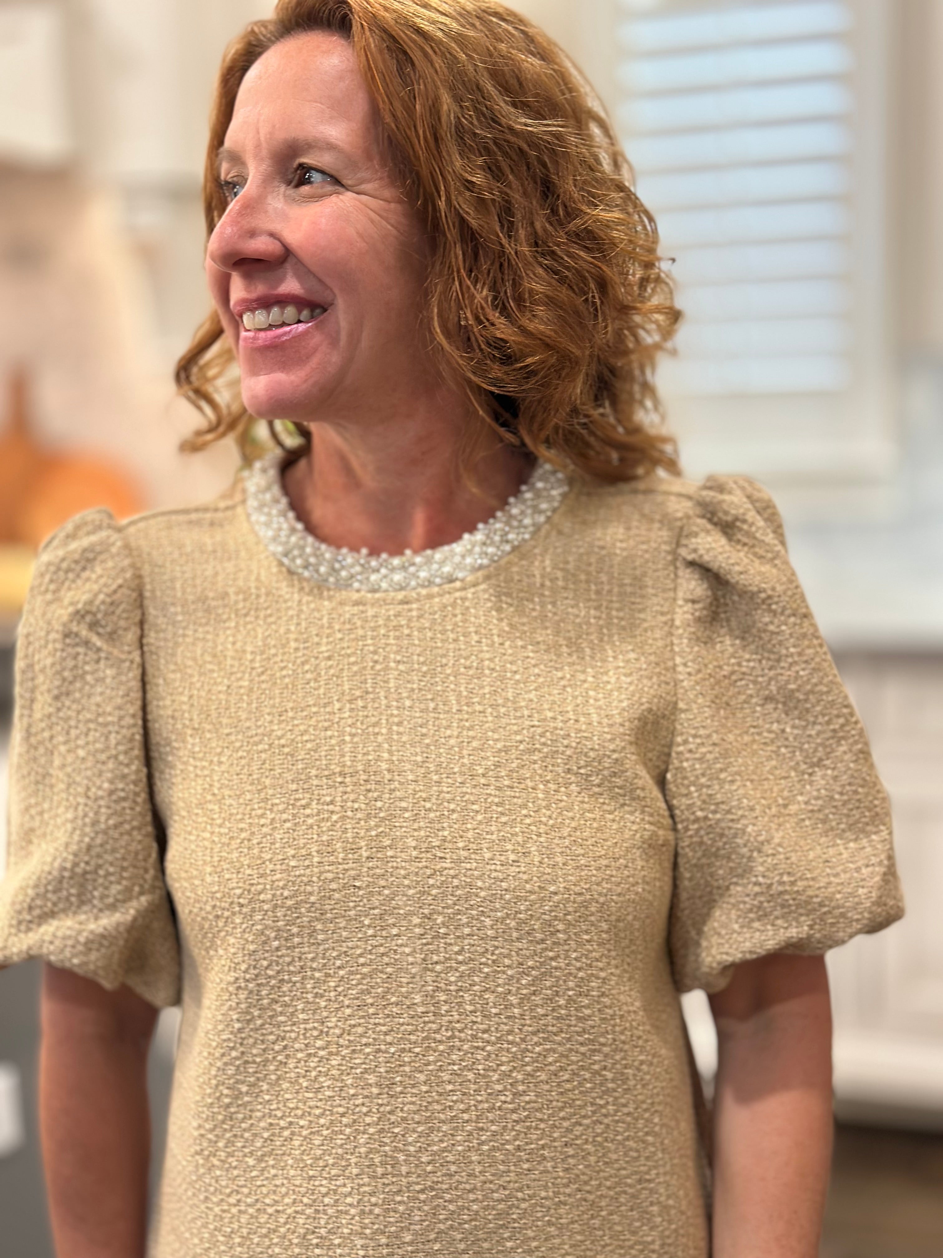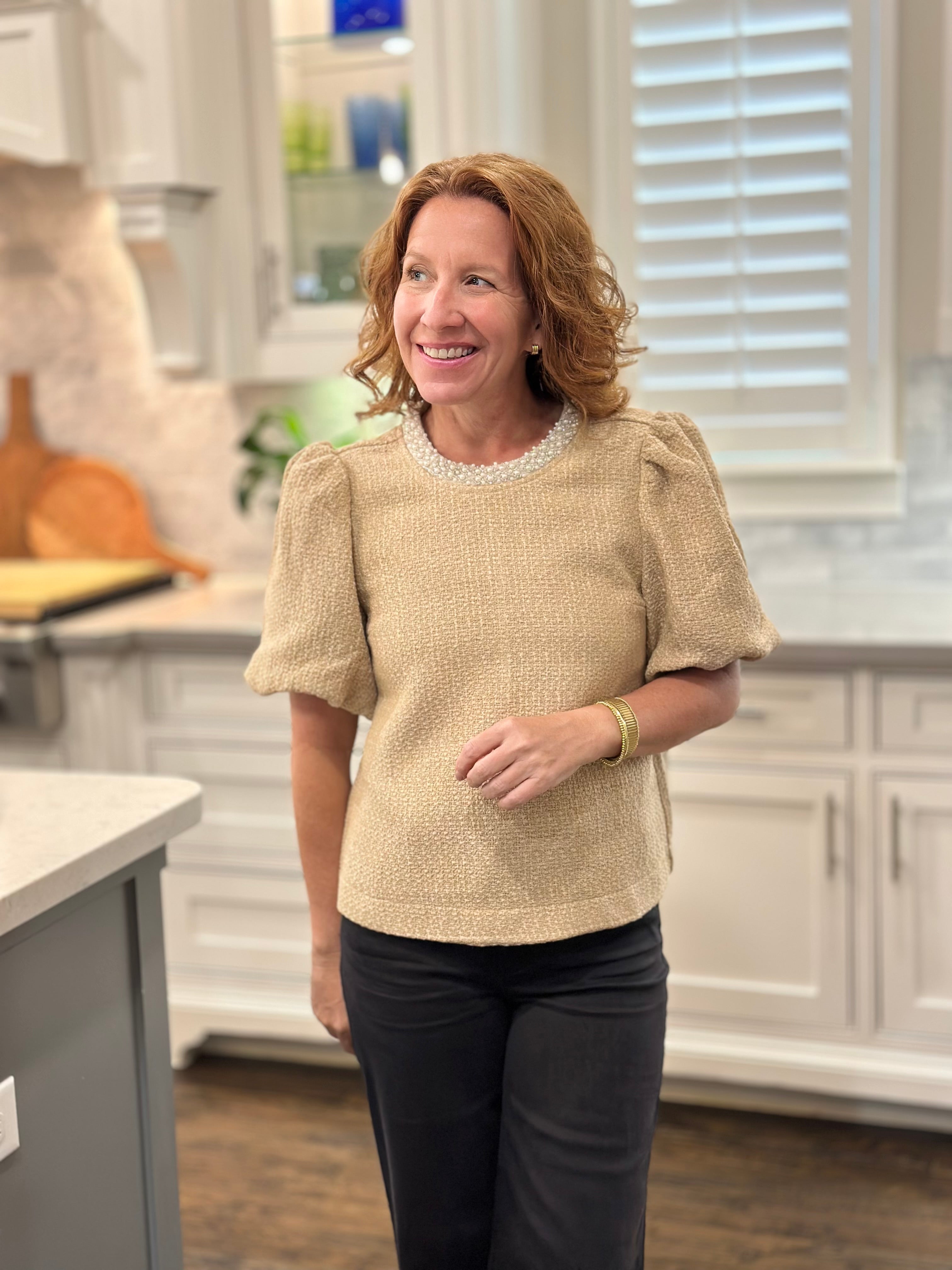 Get ready to steal the spotlight in this fabulous statement top that's bursting with personality. The intricate beaded neckline shimmers and shines, drawing all eyes upward, while the charming puff sleeves that taper at the elbow bring a delightful retro-meets-now vibe.