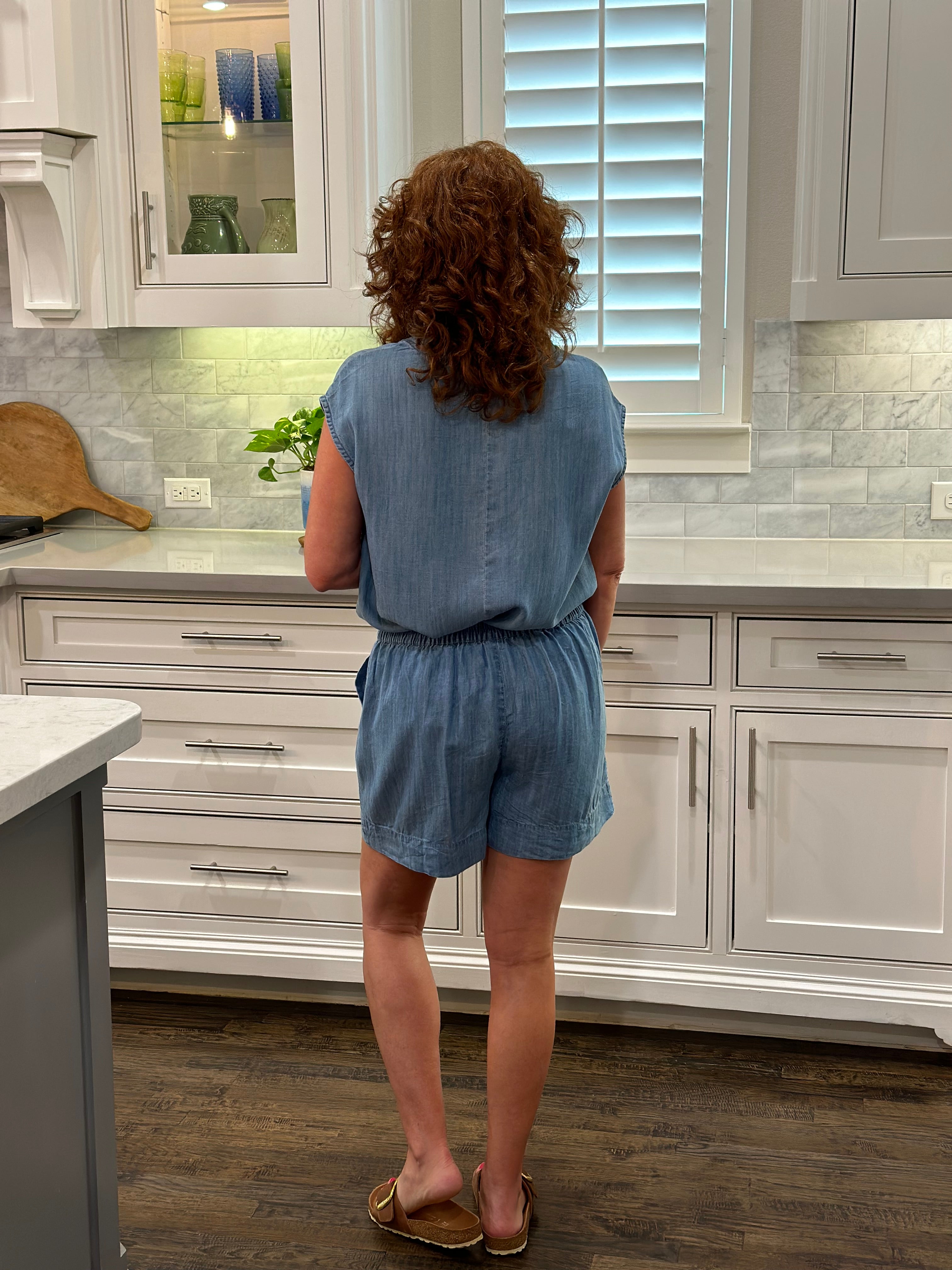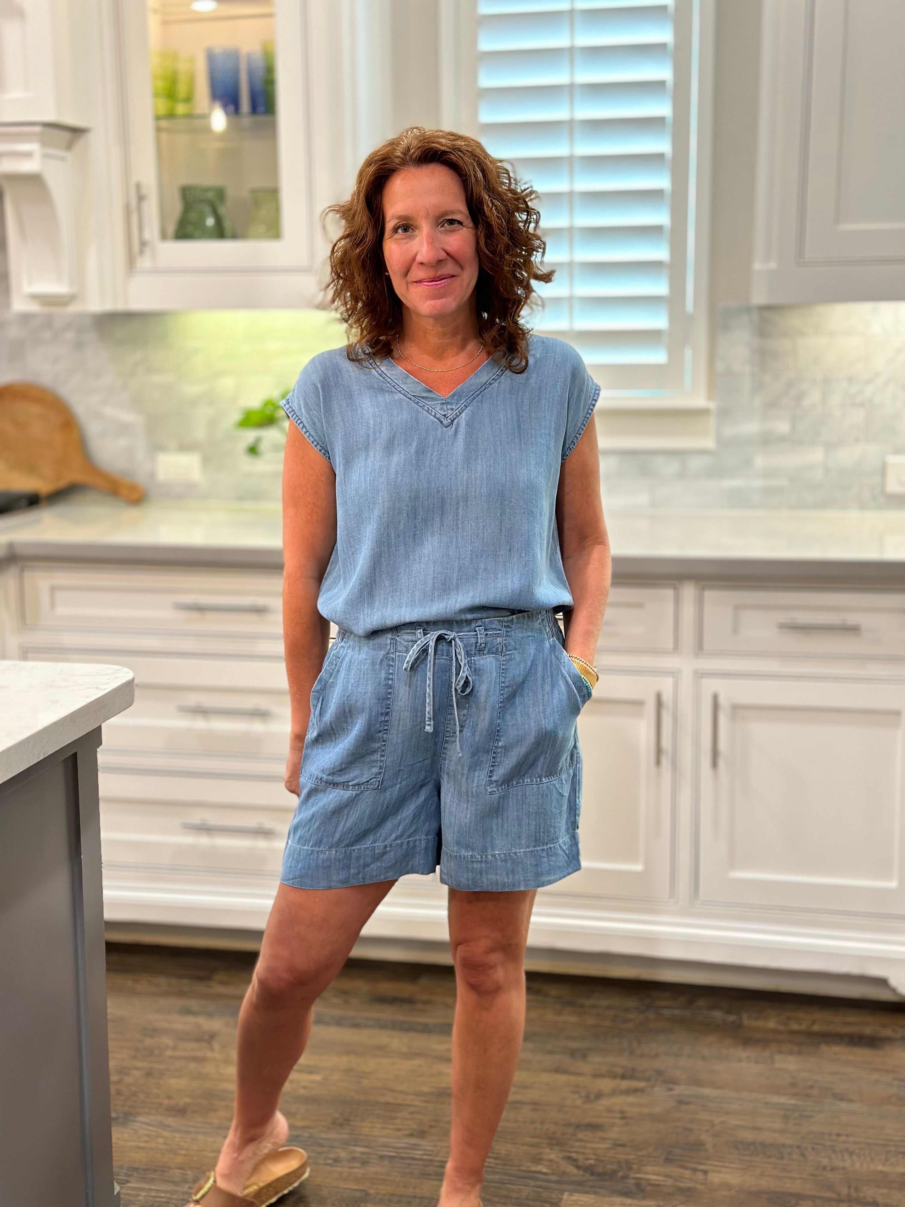 Classic style and easy fit will make these shorts your go to all season long. Front pockets, wide leg opening, stretch waist in back and tie front for a fun chic look. Wear as a set with Ivy Jane - Denim V-Neck Tee.