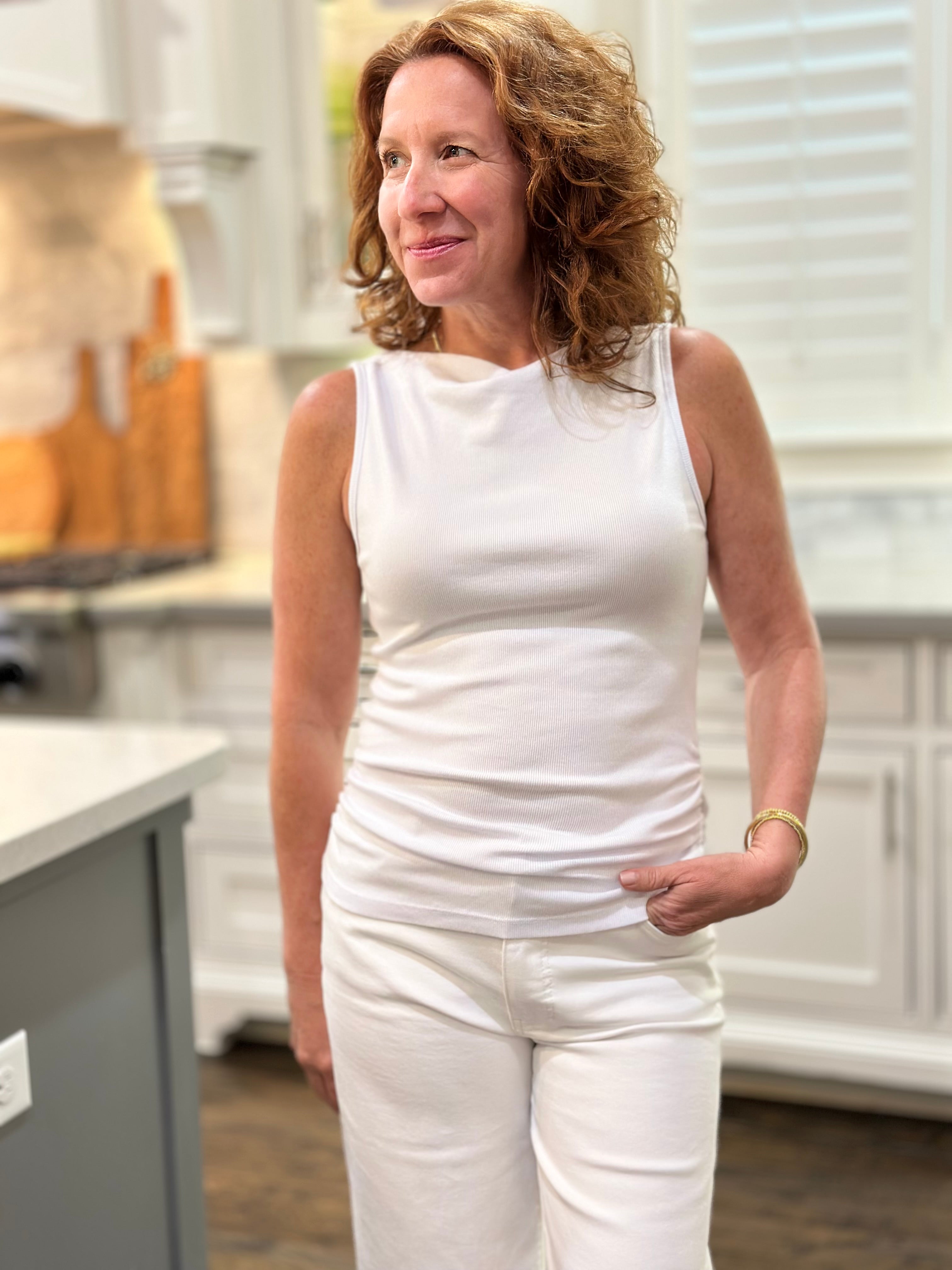 The Coco Tank features an angular envelope neckline that stops at the high shoulder. This perfect day-to-night top is accented with figure-flattering ruching that hugs the waist. Can be worn both tucked and un-tucked. Made from a soft Ultra Rib fabric that washes well and keeps its shape throughout wearing.