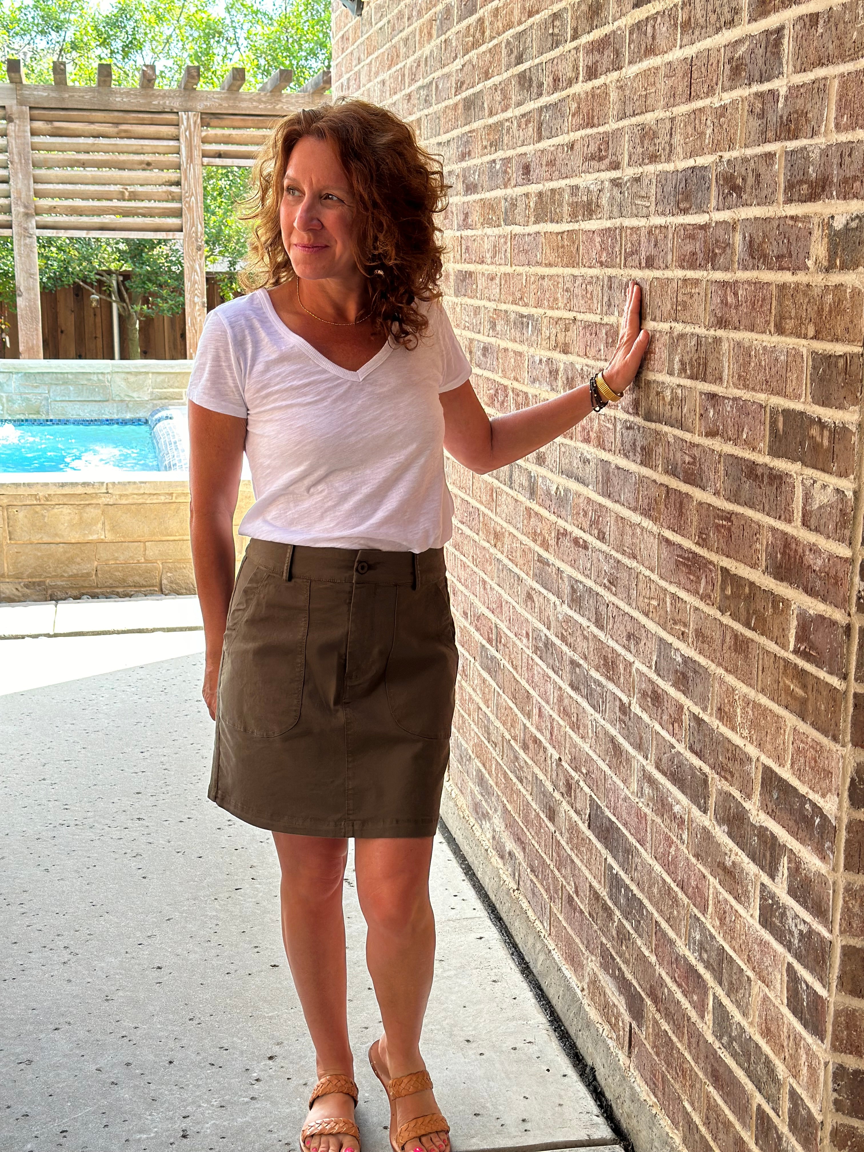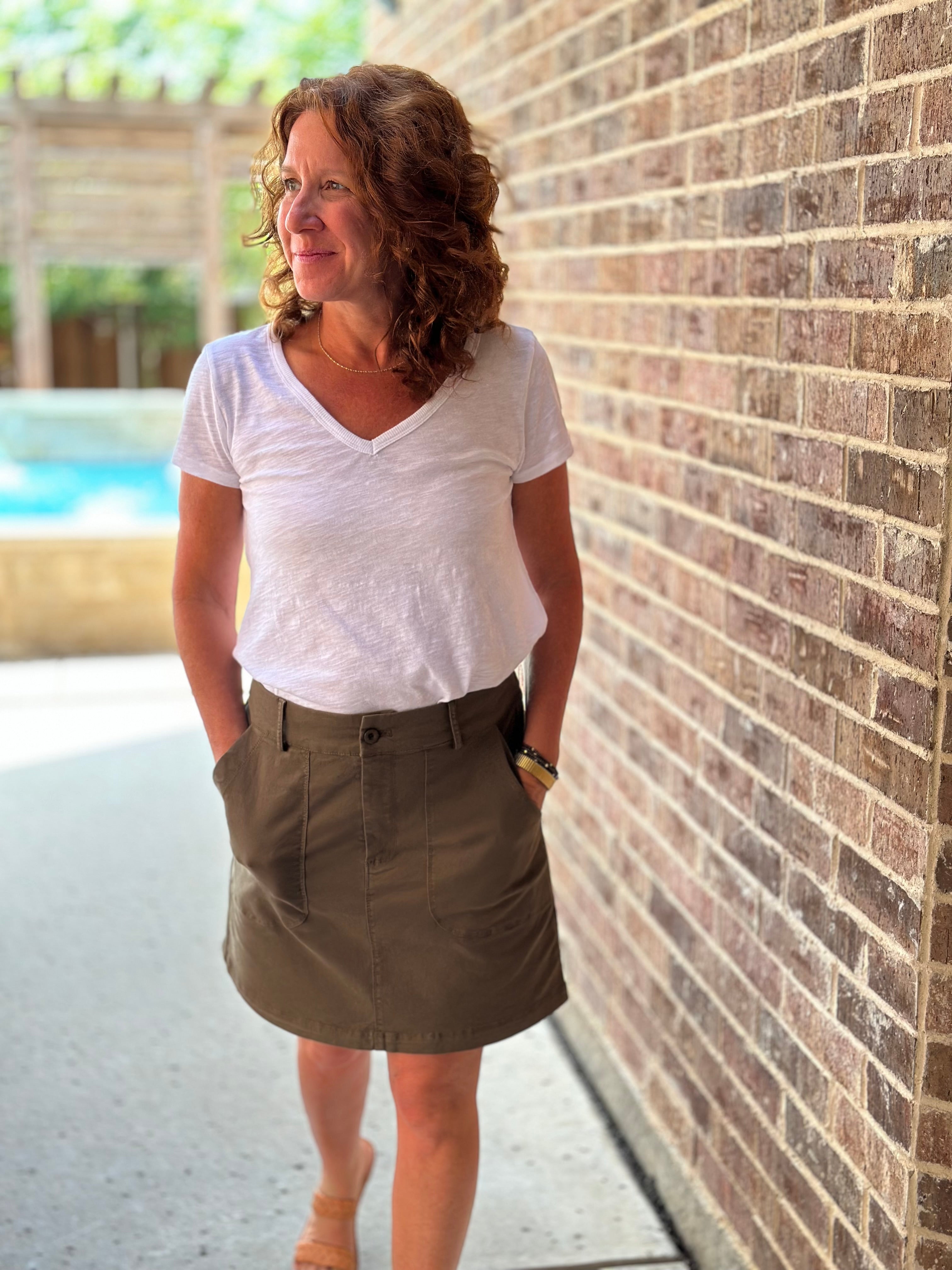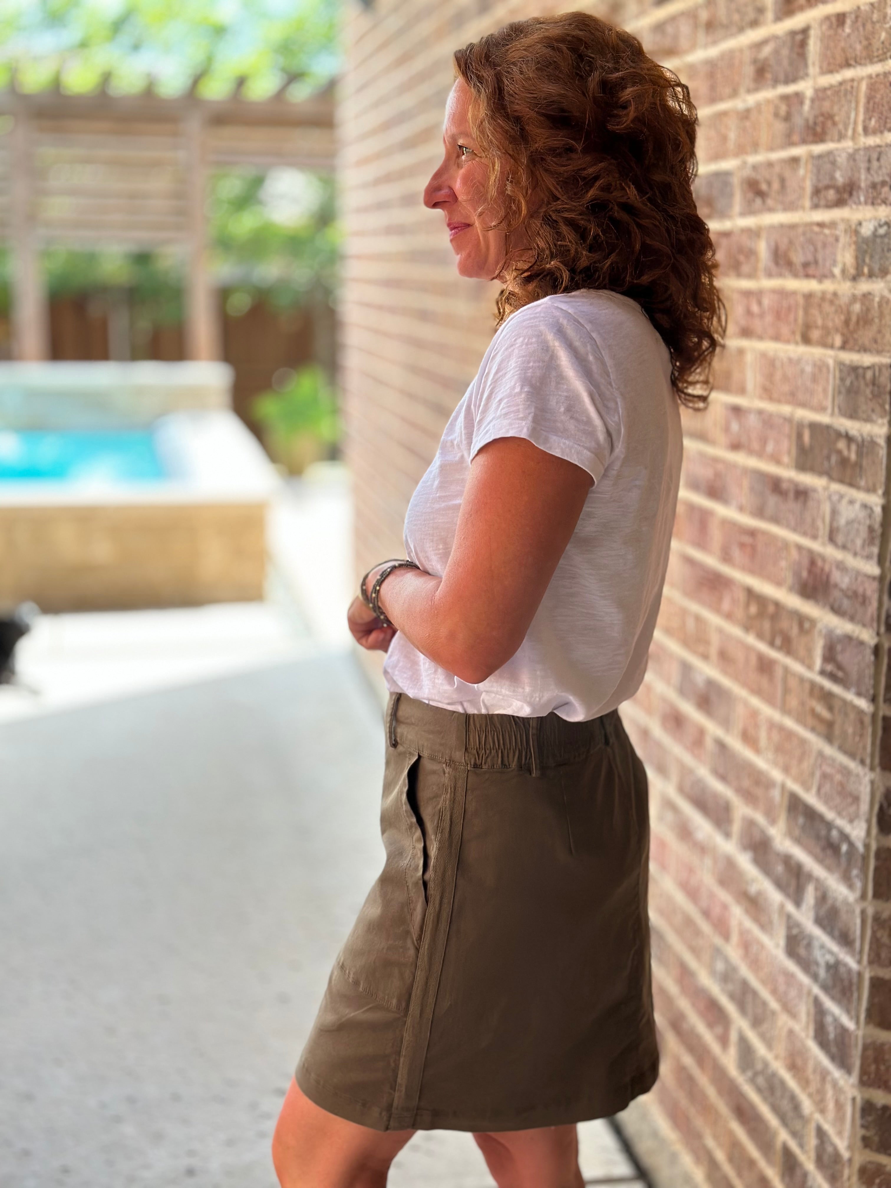 The skirt that will be at the front of your closet every week. Easy, strechy, comfy...your go to running around, vacations, brunches, date night skirt.