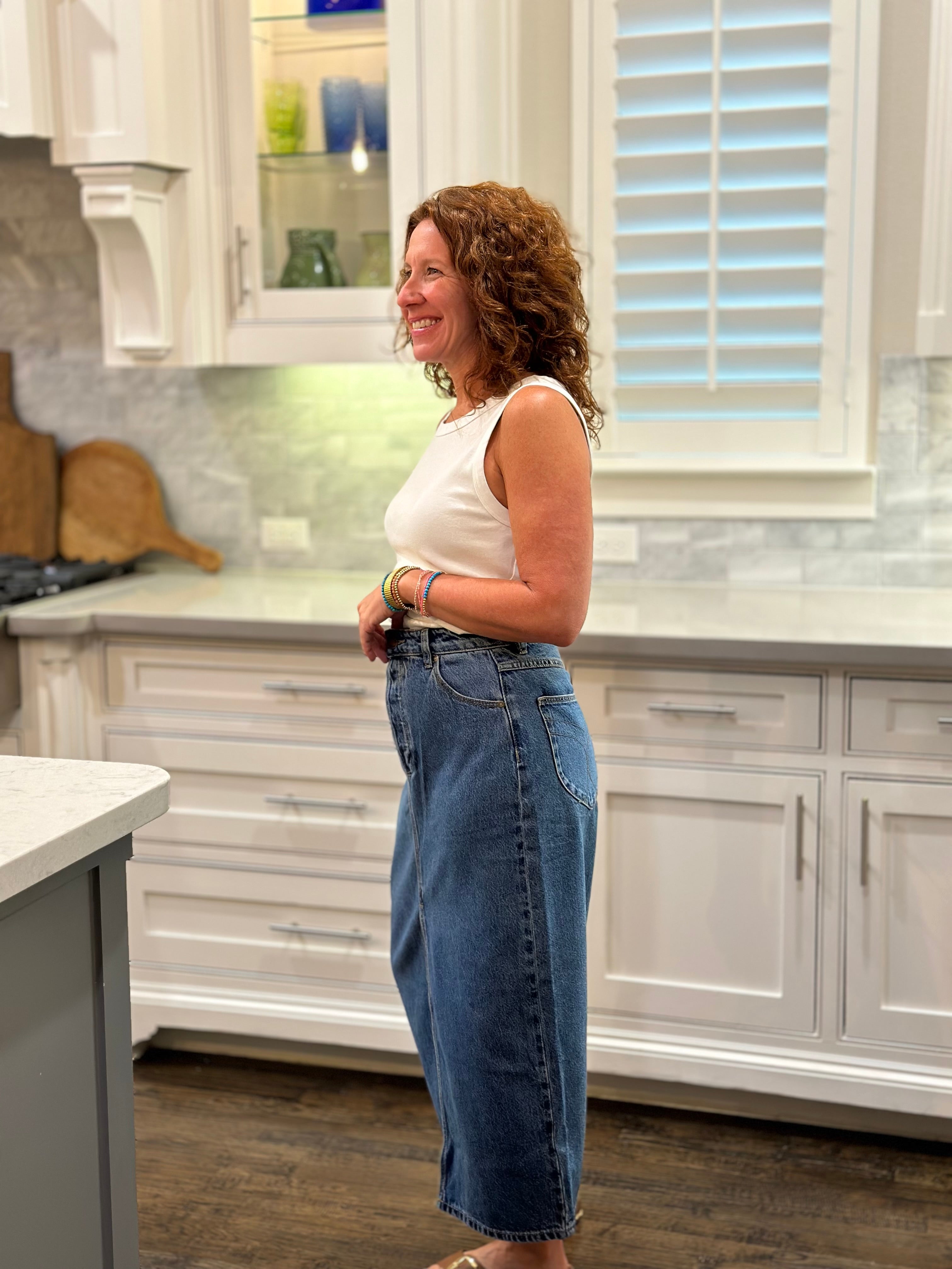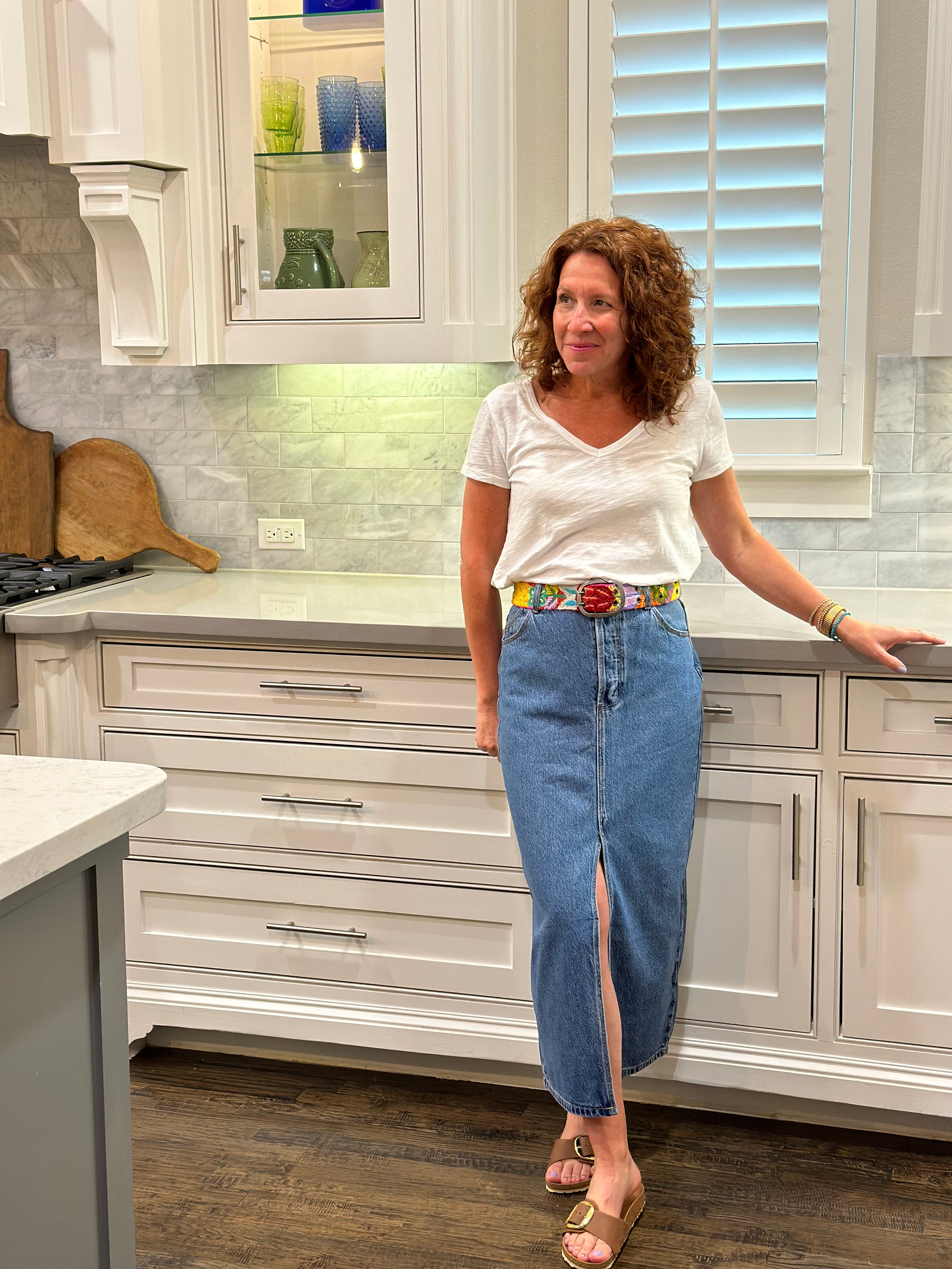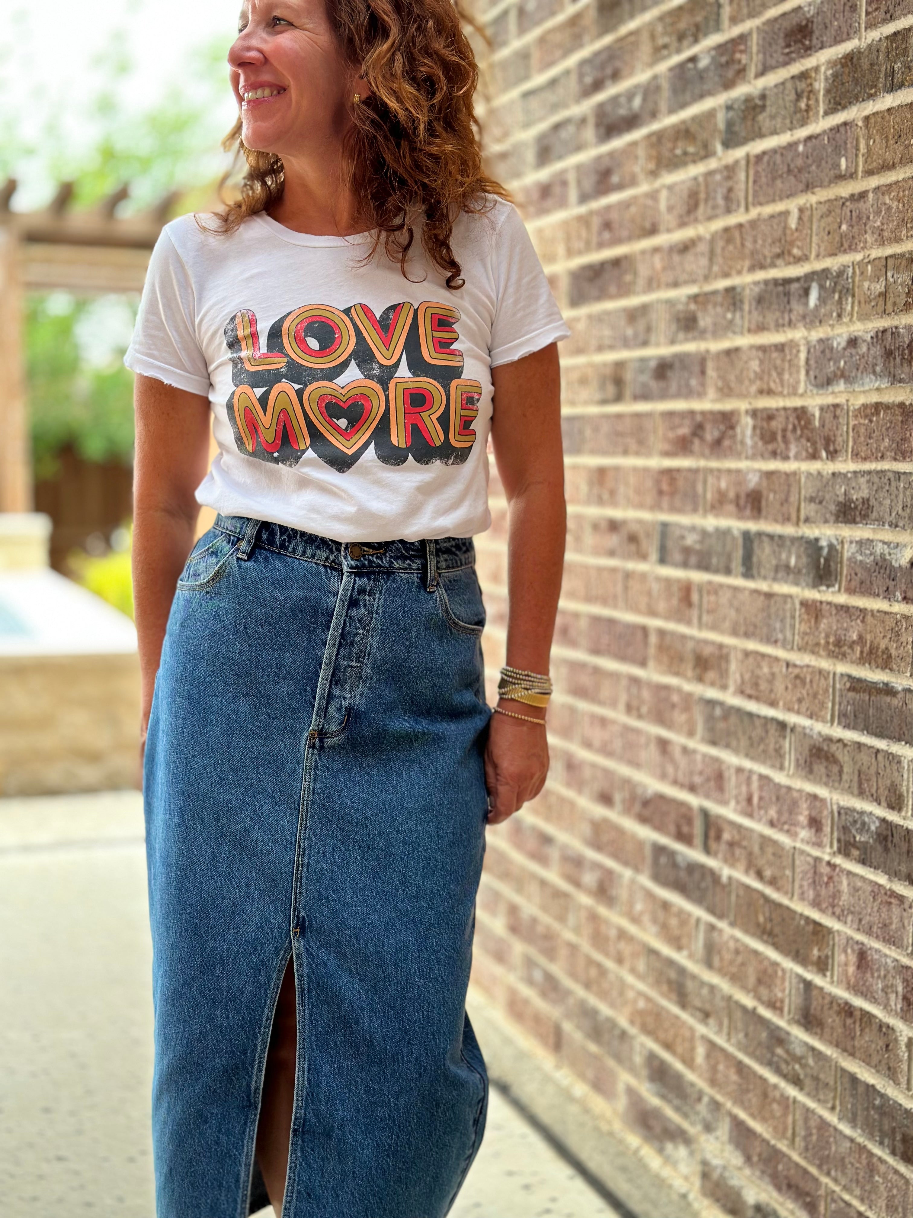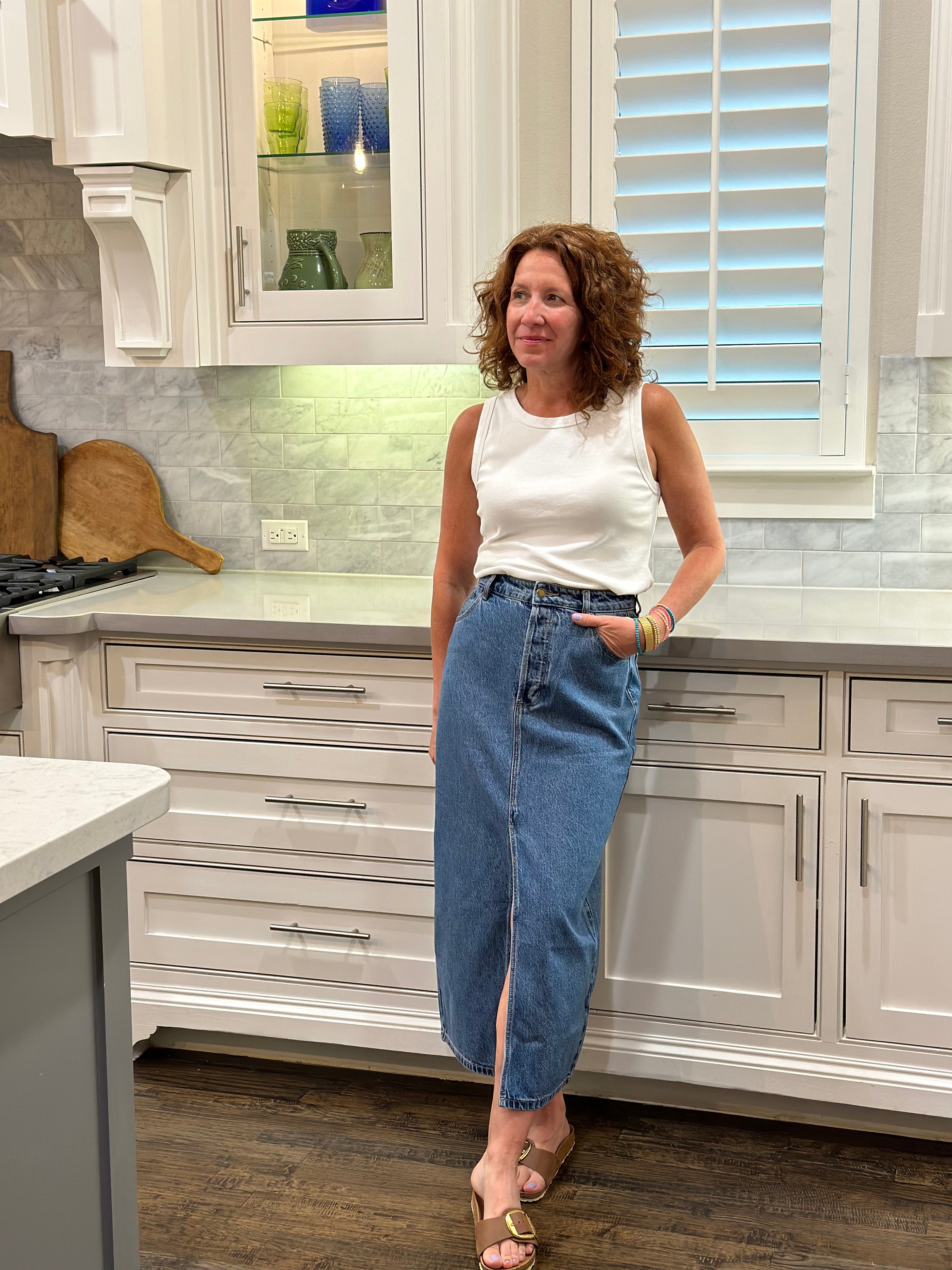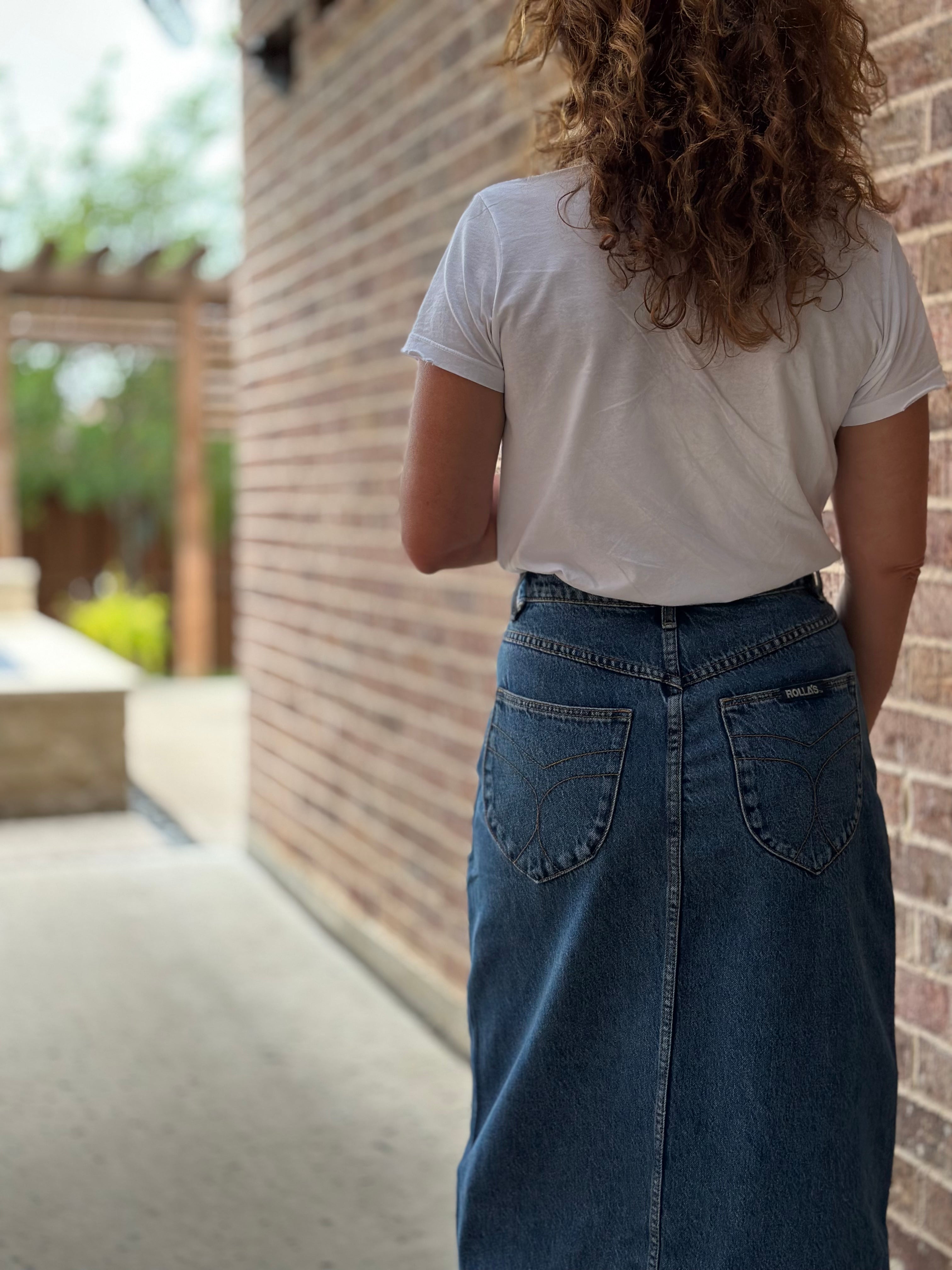 This high rise, A-line long denim skirt with front split has a vintage feel with Rolla's signature back pockets.
